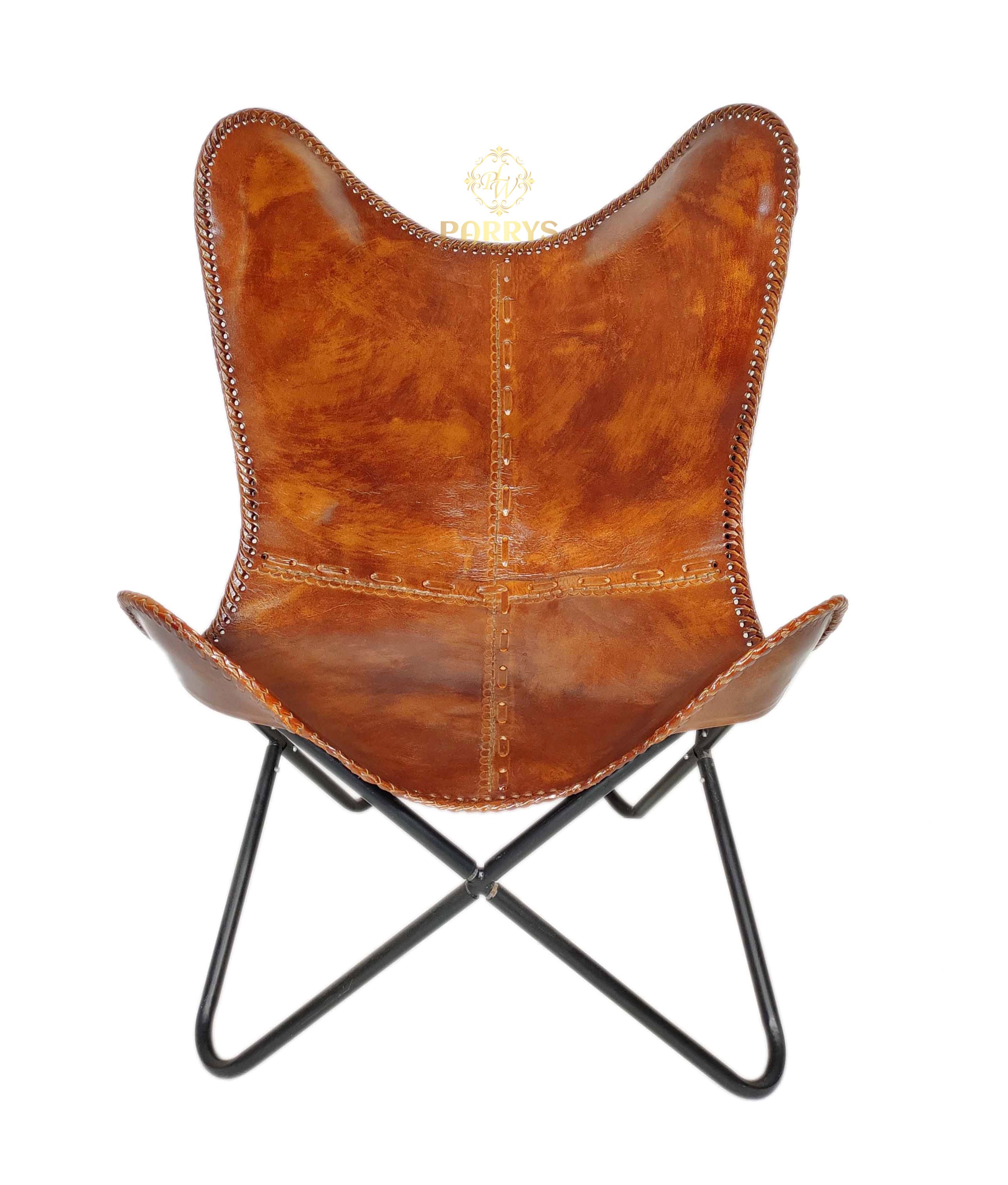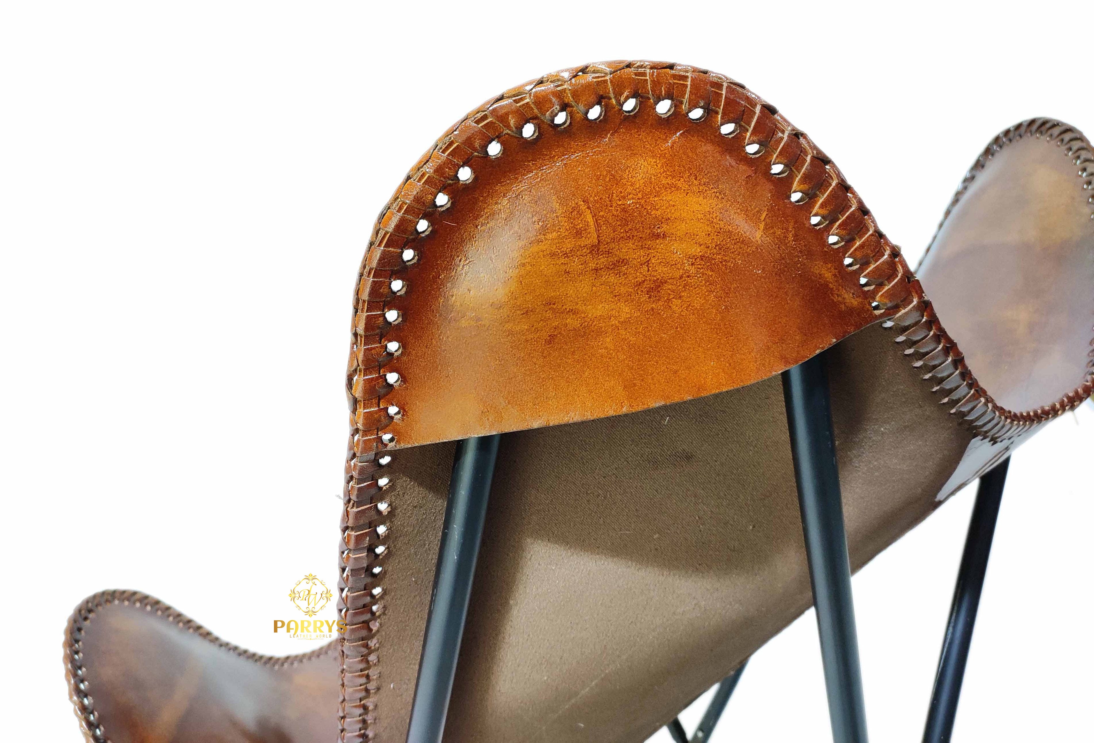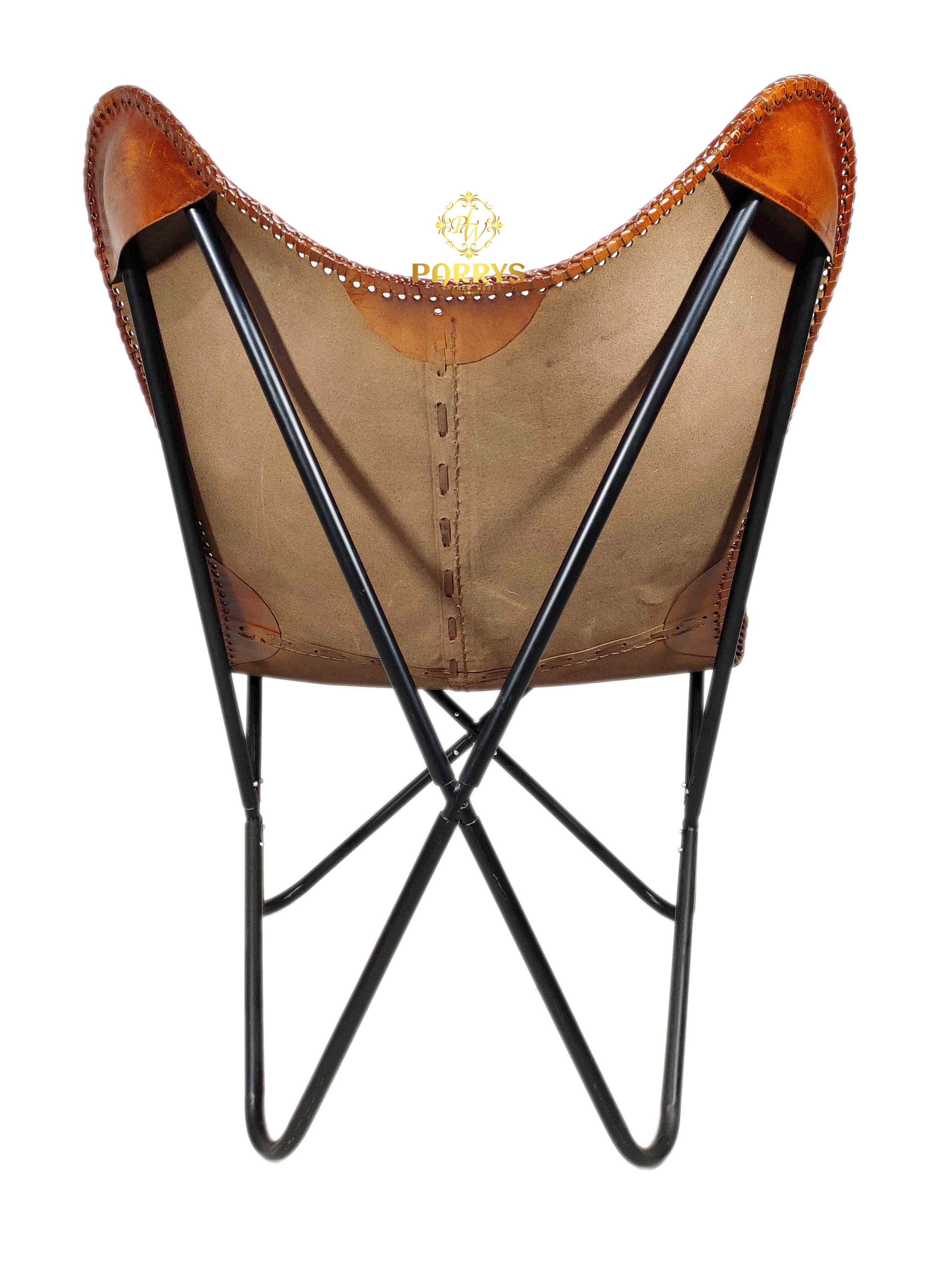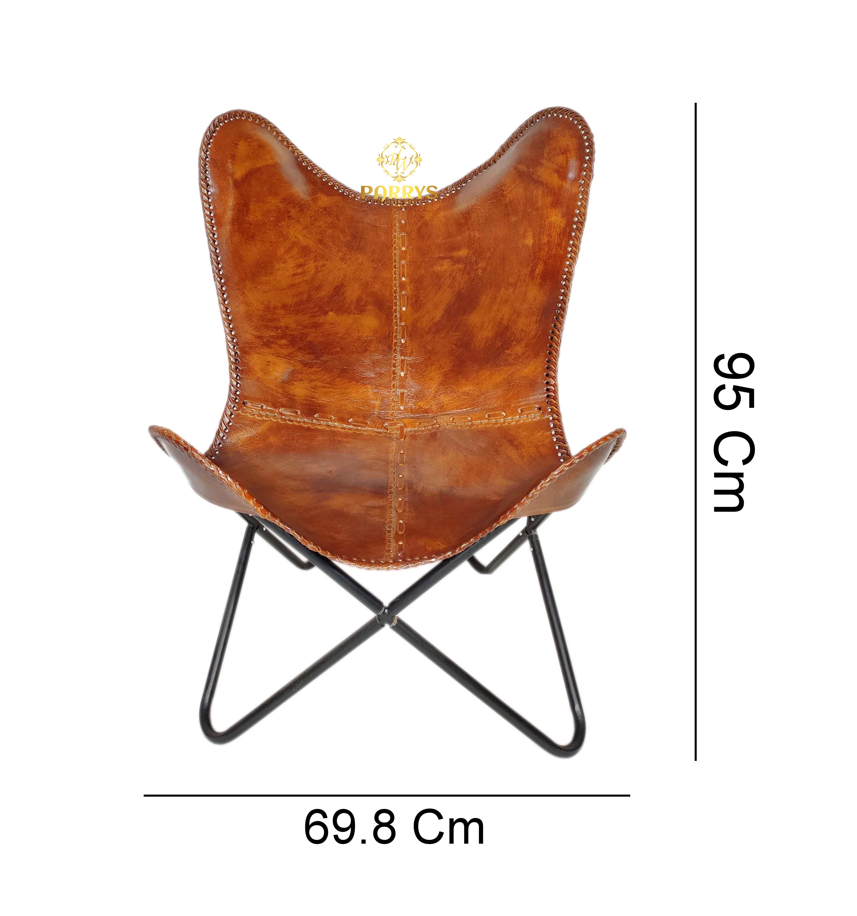 Warm, polished, and instantly inviting the Classic Caramel Leather Butterfly Chair adds a rich caramel glow to any space while preserving the effortless comfort of the iconic butterfly silhouette. Handcrafted from premium top‑grain leather, the seat features subtle tonal variation and a soft sheen that will deepen into a beautiful patina with everyday use. Hand‑laced edging and precise panel stitching showcase artisan craftsmanship, and the powder‑coated iron frame offers a sleek, minimalist profile with dependable stability. A refined accent for living rooms, reading nooks, studios, or modern office lounges.
