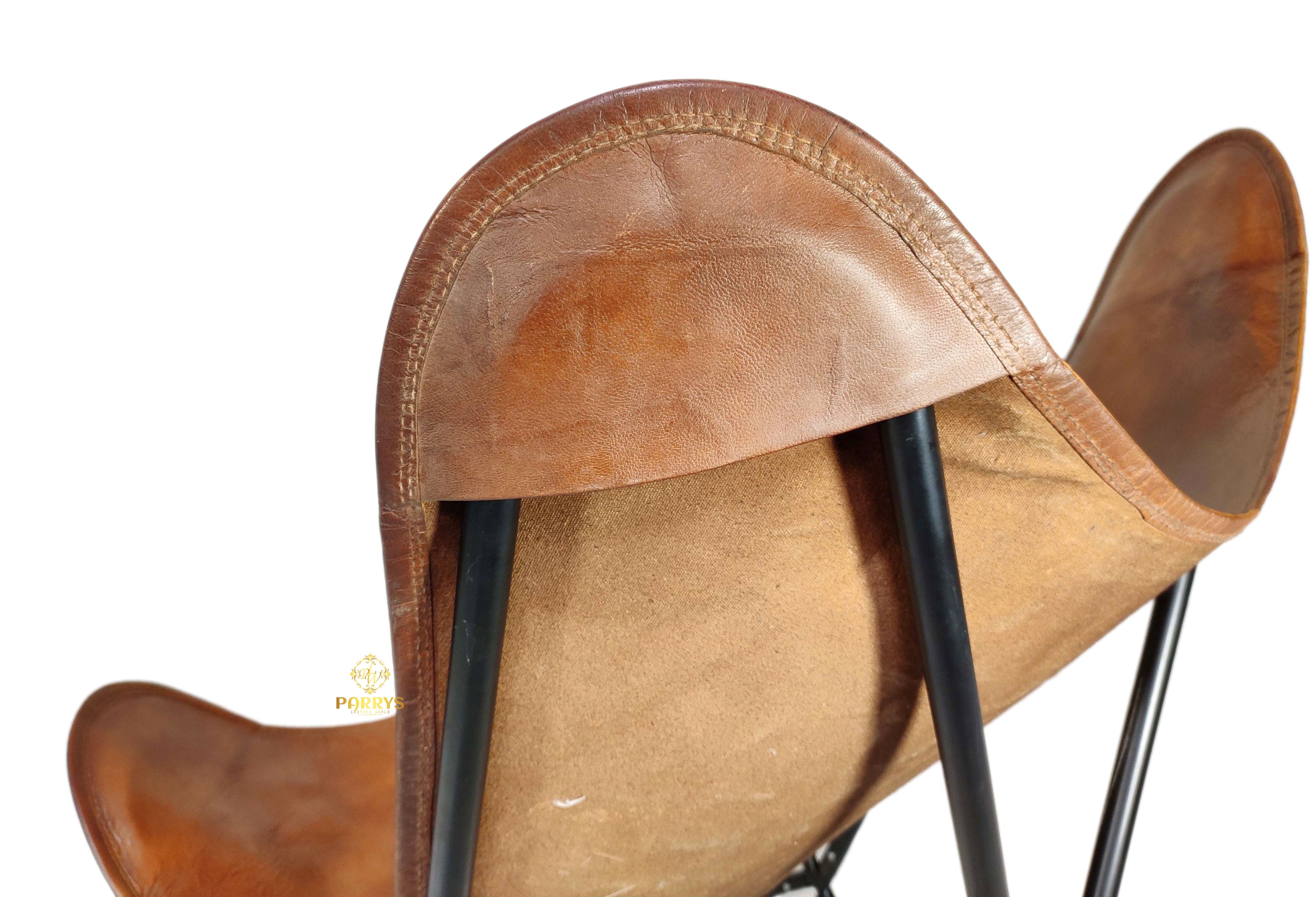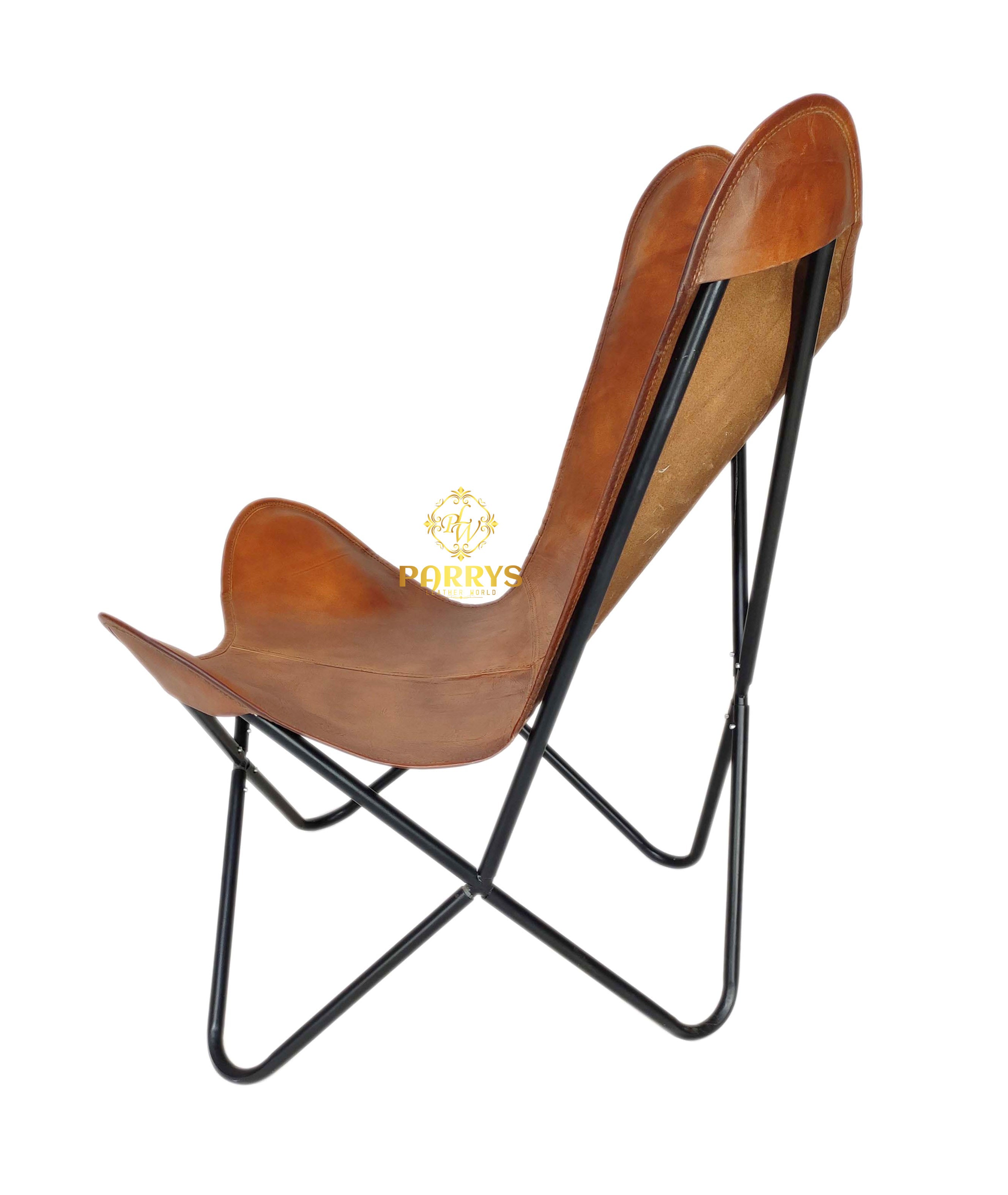 Warm, sun‑washed, and inviting, the Desert Caramel Leather Butterfly Chair brings a golden‑caramel tone inspired by desert light to the iconic sling silhouette. Handcrafted from premium top‑grain leather, the seat shows natural grain depth and a soft sheen that will develop a beautiful patina with everyday use. The ergonomic butterfly shape cradles the body for effortless lounging, while clean panel stitching highlights artisan craftsmanship. A powder‑coated iron frame completes the slim, modern profile with dependable stability for living rooms, reading nooks, bedrooms, studios, and office lounges.