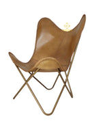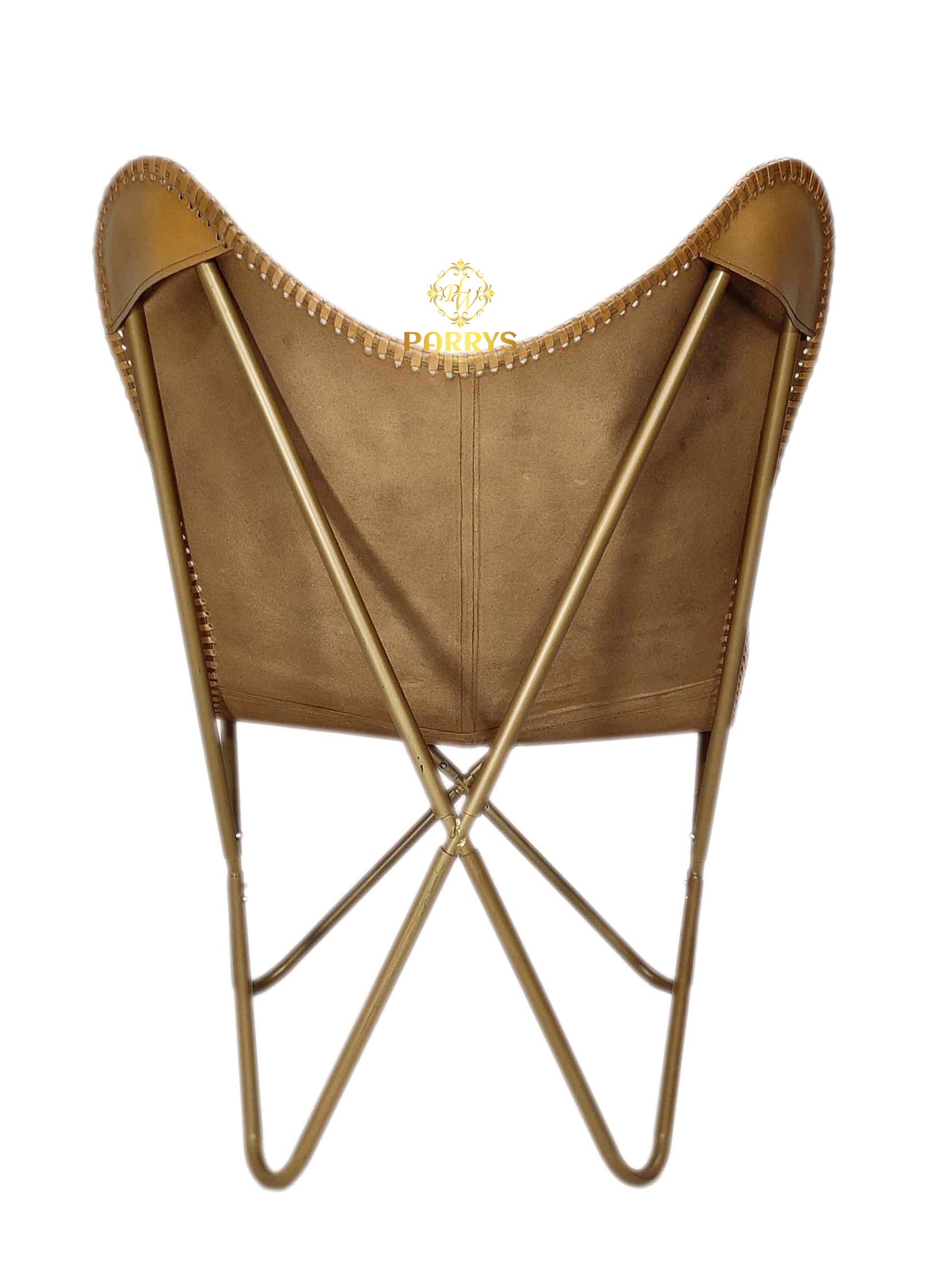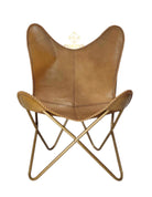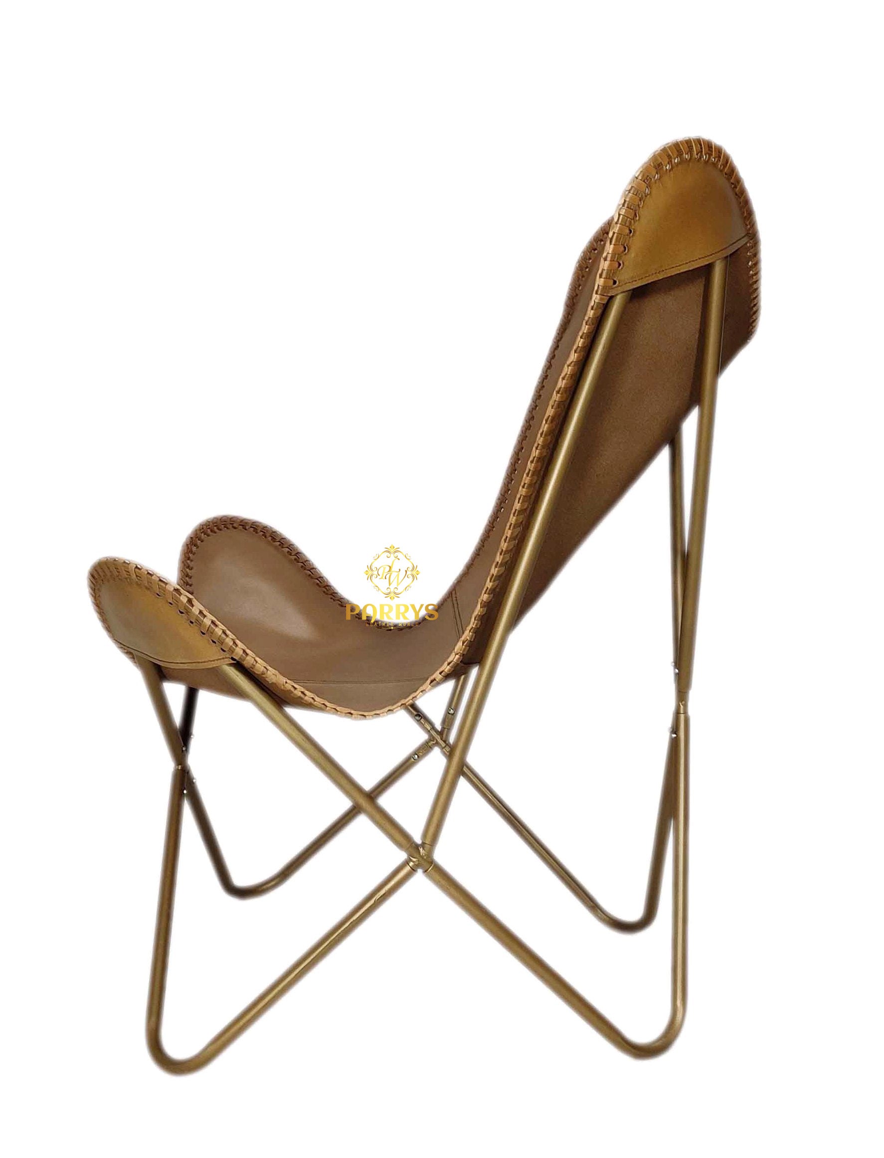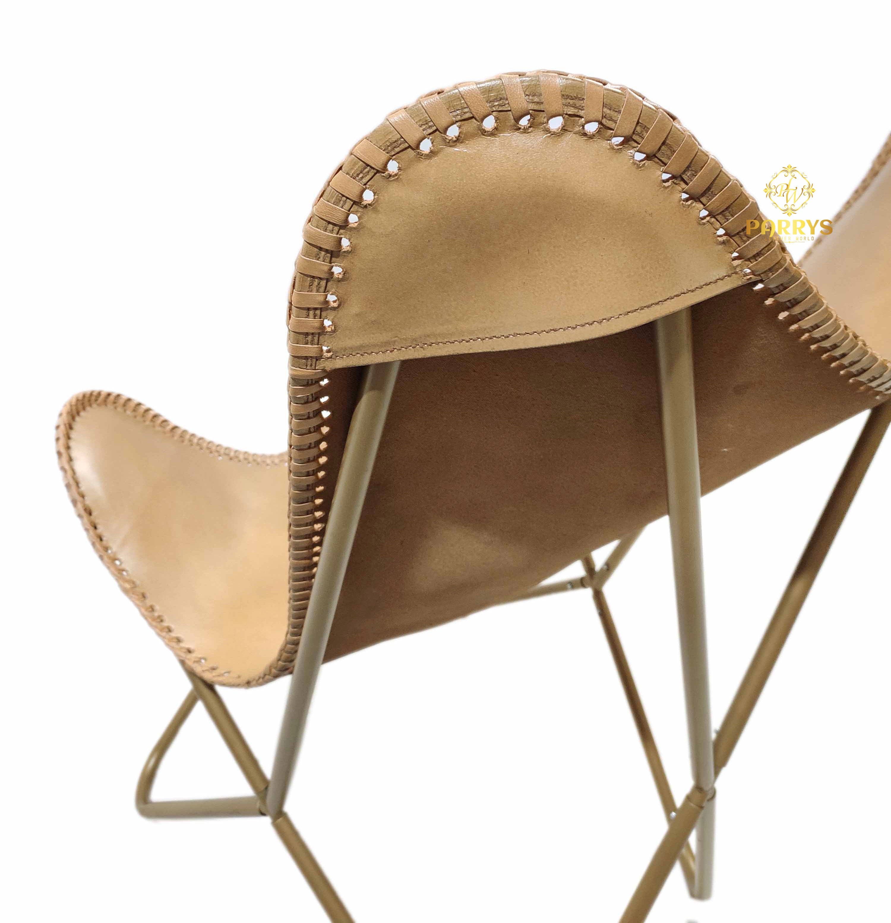 Calm and contemporary, the Desert Sand Leather Butterfly Chair brings a sun‑washed, earthy tone to any space. Upholstered in supple full‑grain leather in a soft desert‑sand shade, the seat is finished with hand whip‑stitched edging for a crafted look. The classic butterfly silhouette gently cradles the body for effortless lounging, while a brass‑toned cross frame keeps the profile light and sturdy. An easygoing statement for modern, boho,