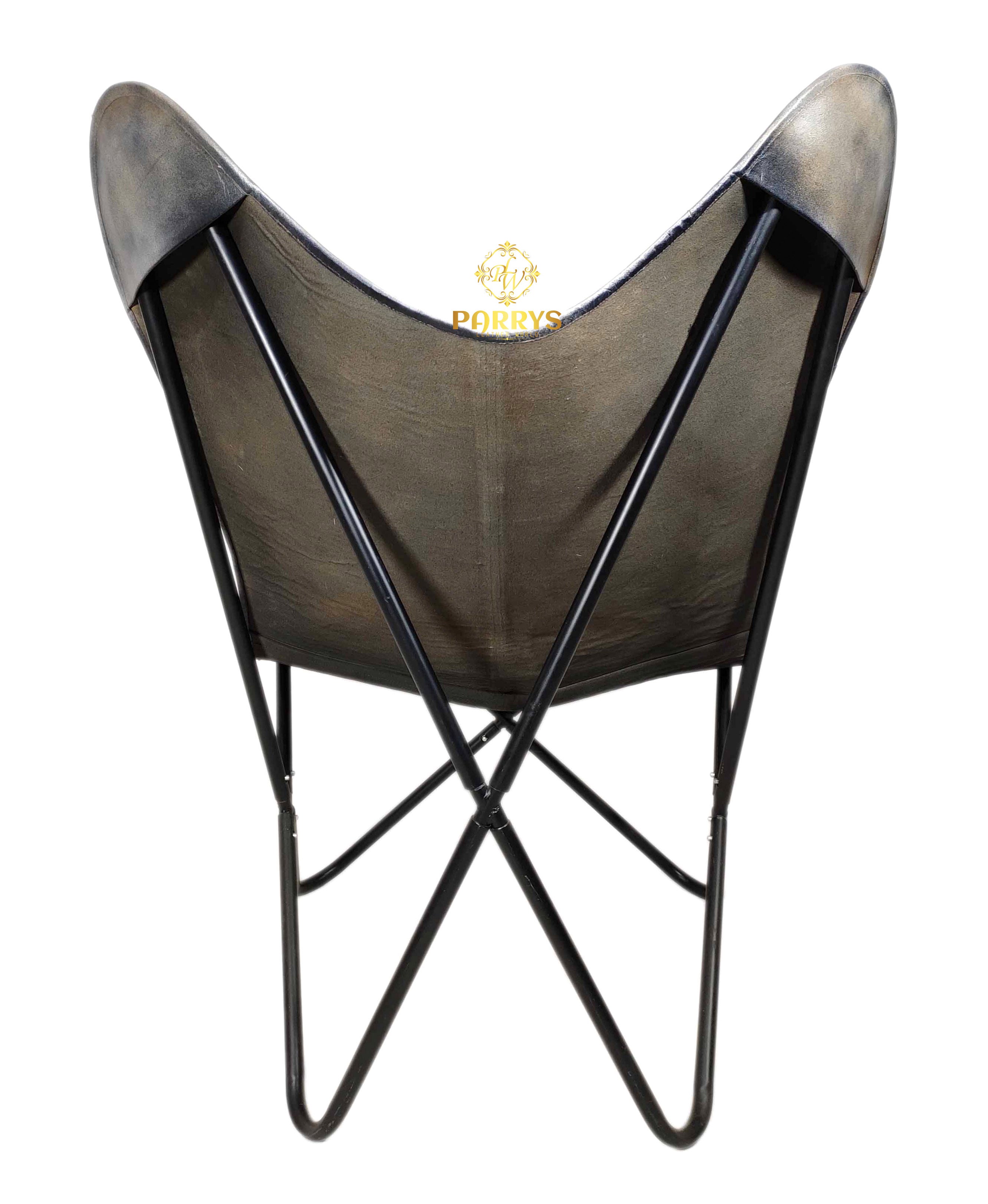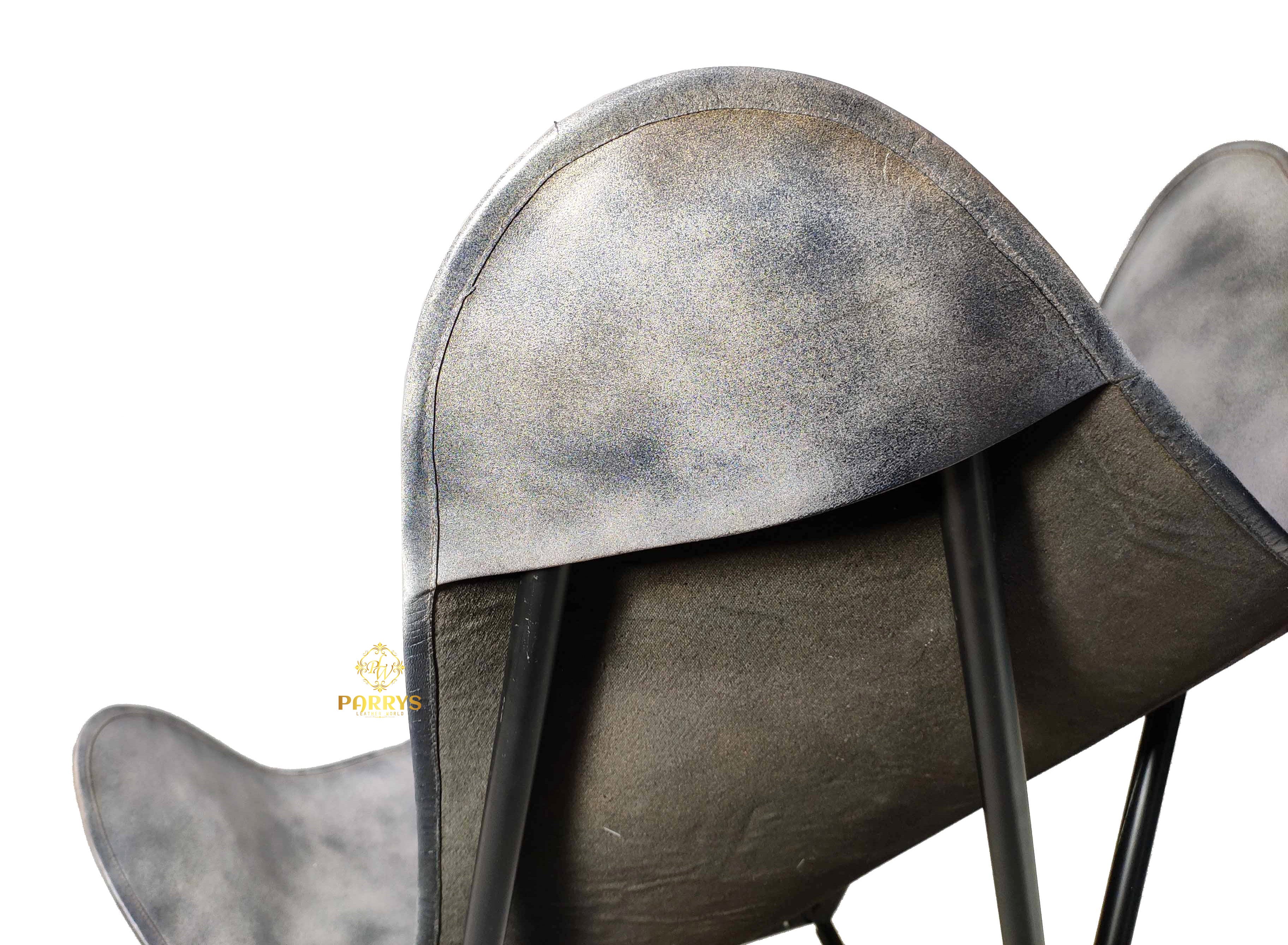 Calm, contemporary, and effortlessly versatile, the Mist Grey Leather Butterfly Chair brings a softly marbled grey tone to the iconic sling silhouette. Handcrafted from premium top‑grain leather, the seat shows delicate cloud‑like variations and a refined matte sheen that will develop a beautiful patina over time. The ergonomic butterfly form cradles the body for relaxed lounging, while precise panel stitching underscores artisan craftsmanship. A powder‑coated iron frame completes the slim, modern profile with dependable stability ideal for living rooms, reading nooks, bedrooms, studios, and office lounges.