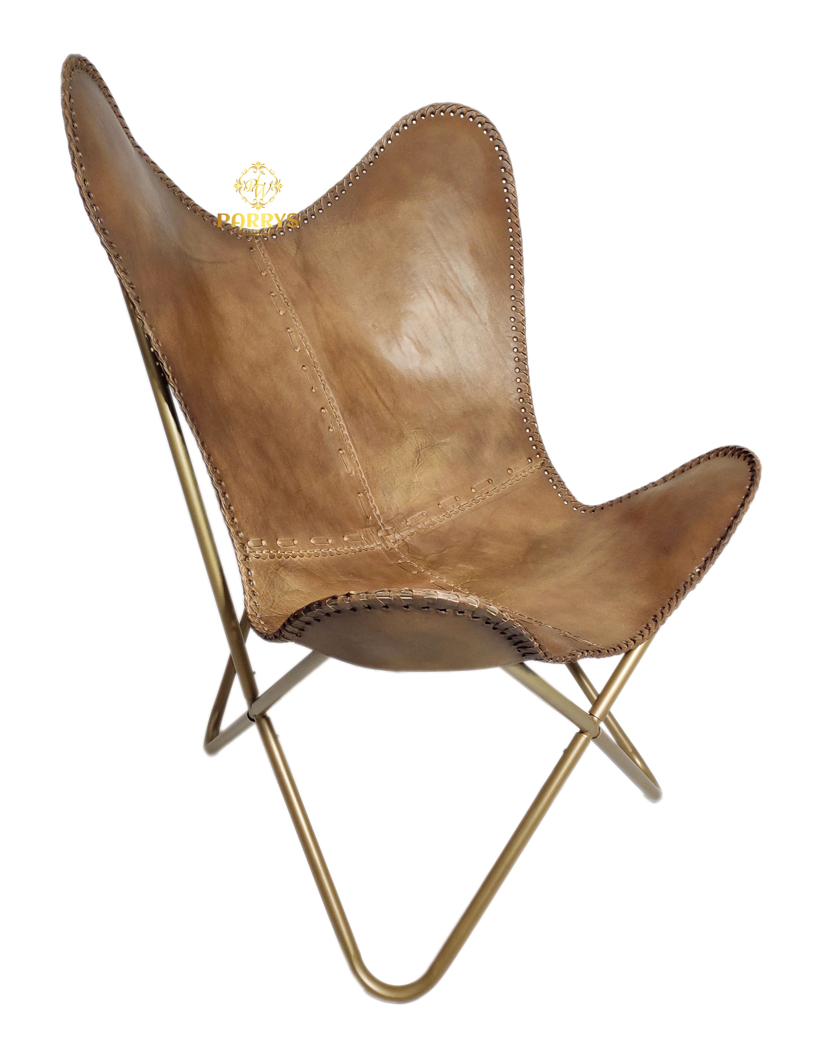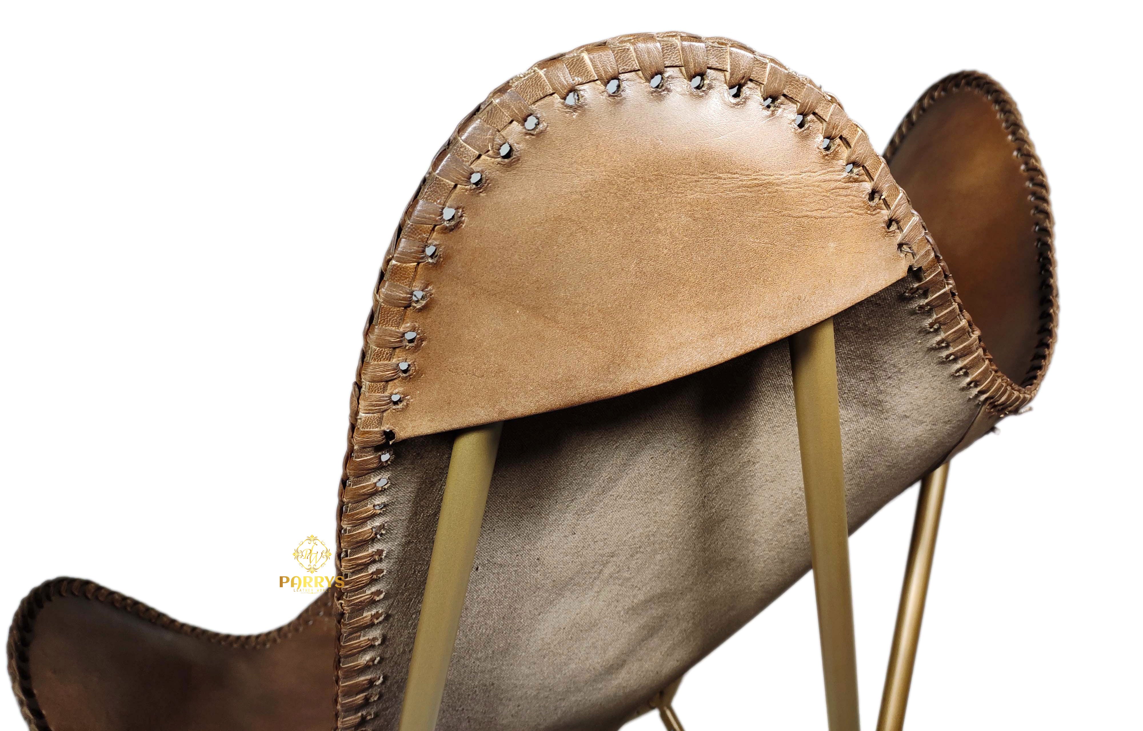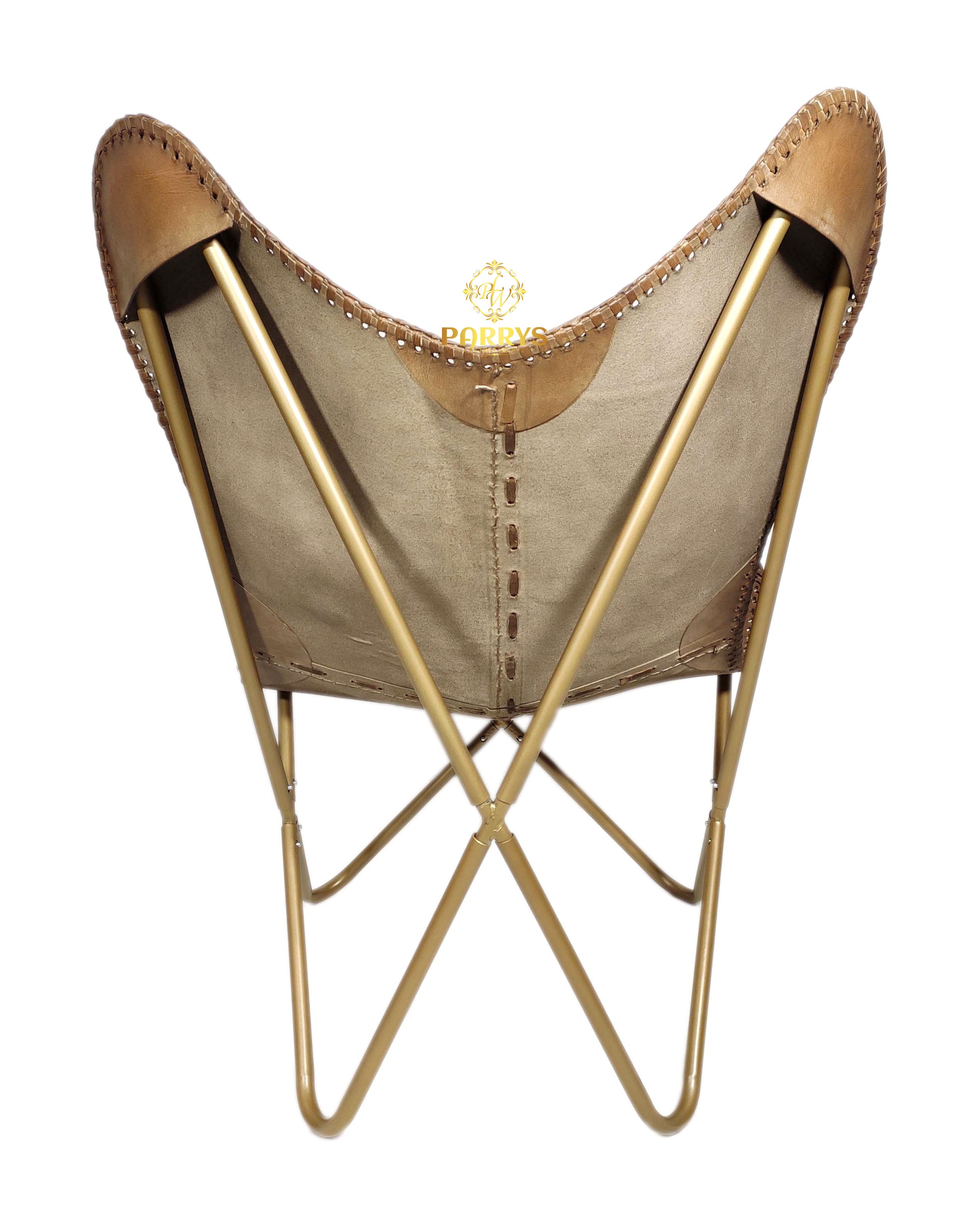 Relaxed and versatile, the Sahara Canvas Leather Butterfly Chair pairs sun‑washed neutrals with artisan detail for an easy, lived‑in look. The seat is crafted from natural canvas backed with supple leather panels in a sandy tan, then finished with hand whip‑stitched edging that traces the iconic silhouette. A gently reclined butterfly form cradles the body for effortless lounging, while the brass‑toned cross frame keeps the profile airy yet sturdy—perfect for calm, minimalist, or boho spaces.