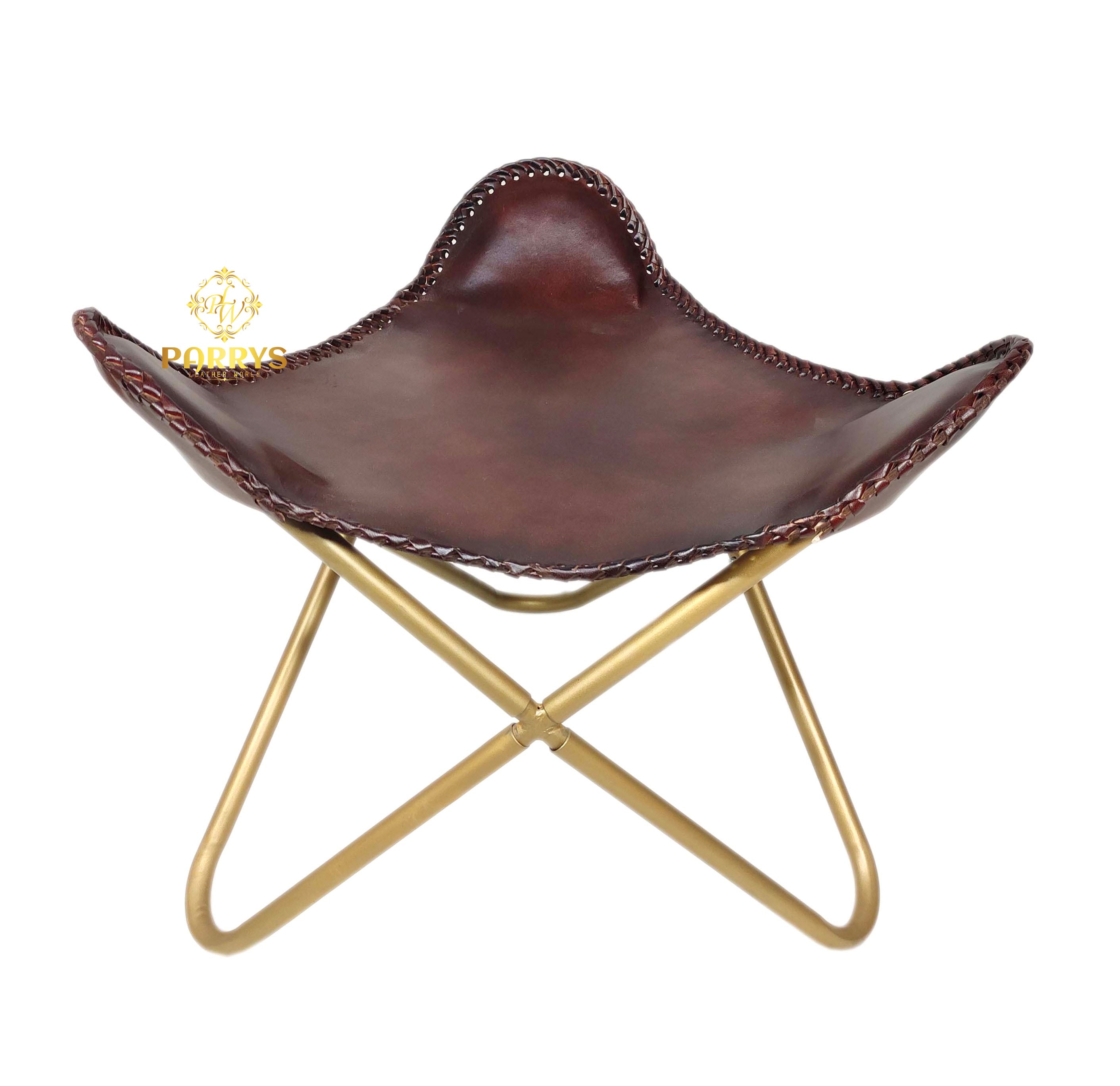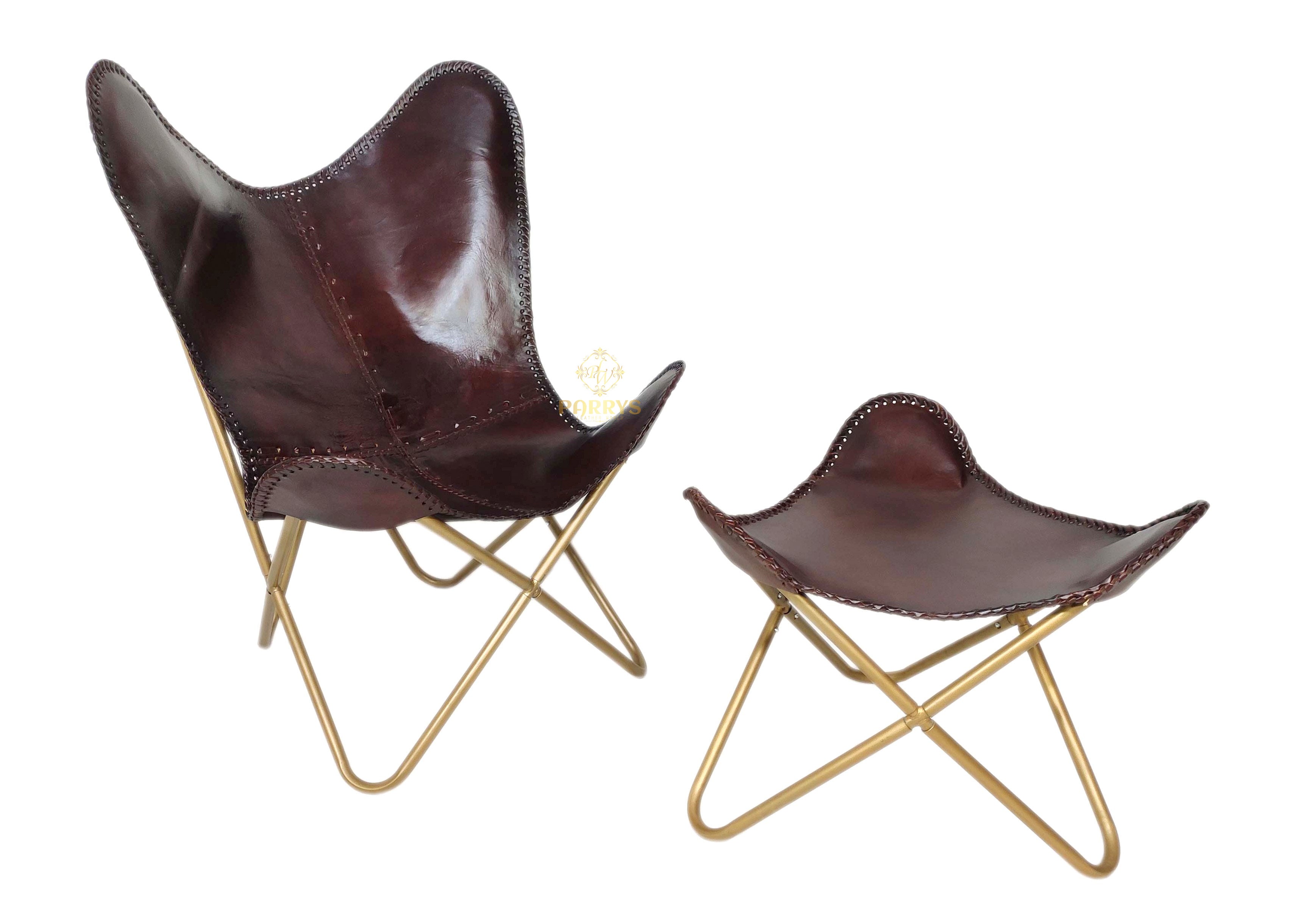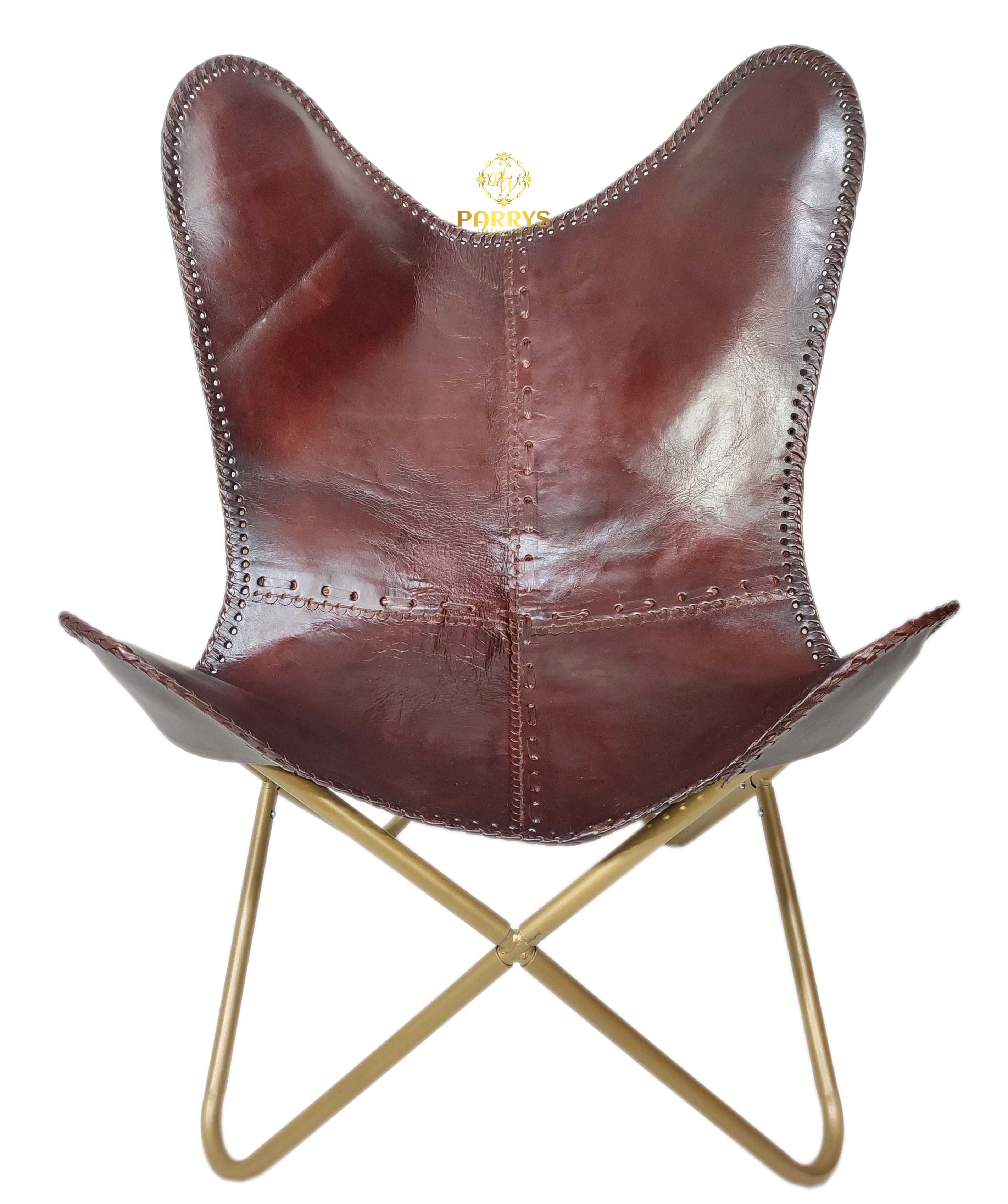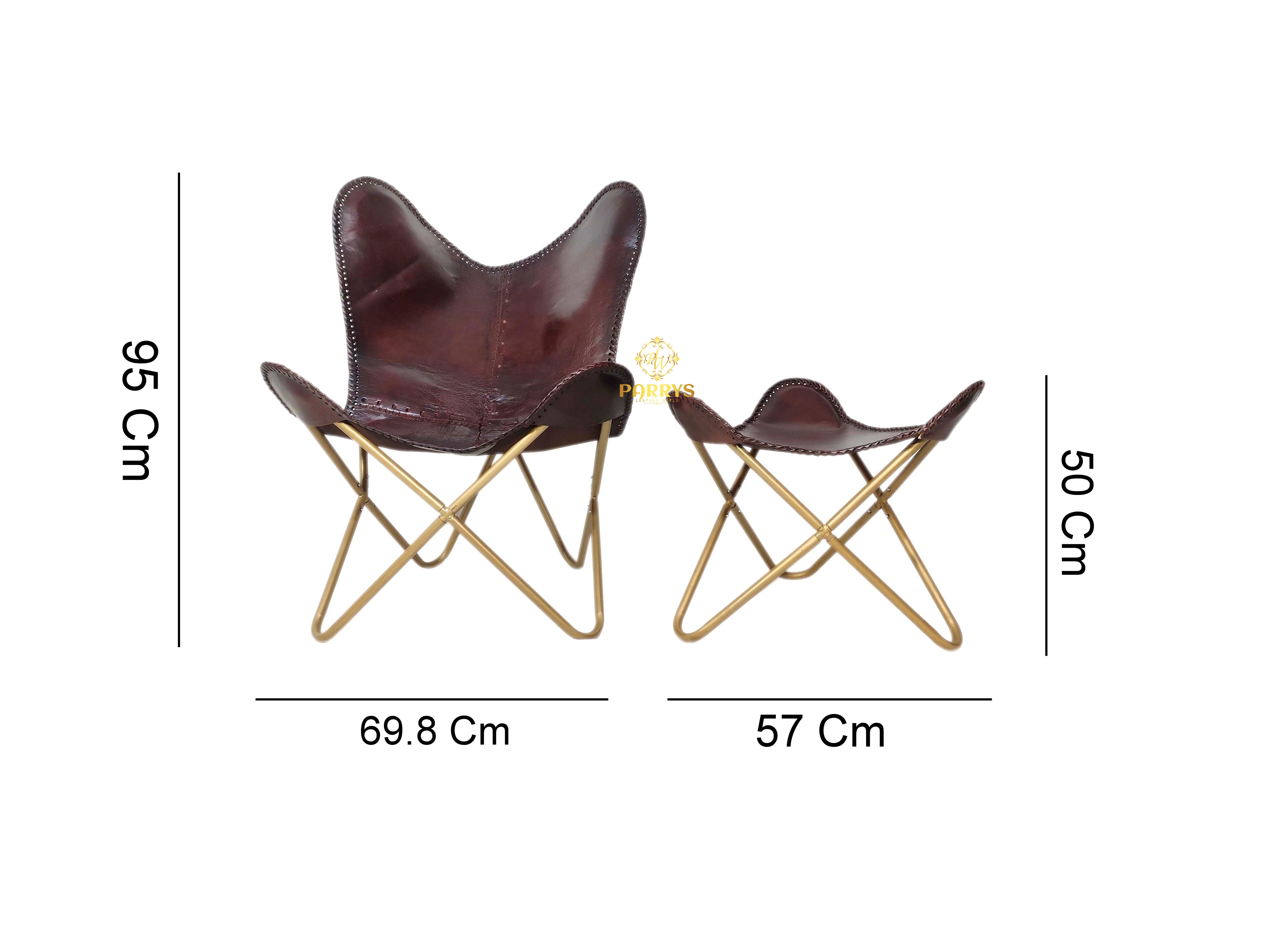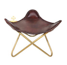 Refined, dramatic, and lounge‑ready, the Maroon Luster Leather Chair & Ottoman pairs a deep maroon finish with warm brass‑tone bases for an elevated statement set. Handcrafted from premium top‑grain leather, both pieces showcase rich tonal depth and a subtle luster that develops a beautiful patina over time. The ergonomic sling contours naturally to the body, while the matching ottoman supports a relaxed recline for reading, sipping, or unwinding. Decorative edge‑stitching and neatly finished seams highlight artisan craftsmanship, and the sculptural crossed bases keep the profile slim and modern.