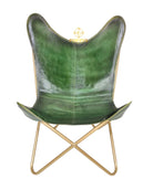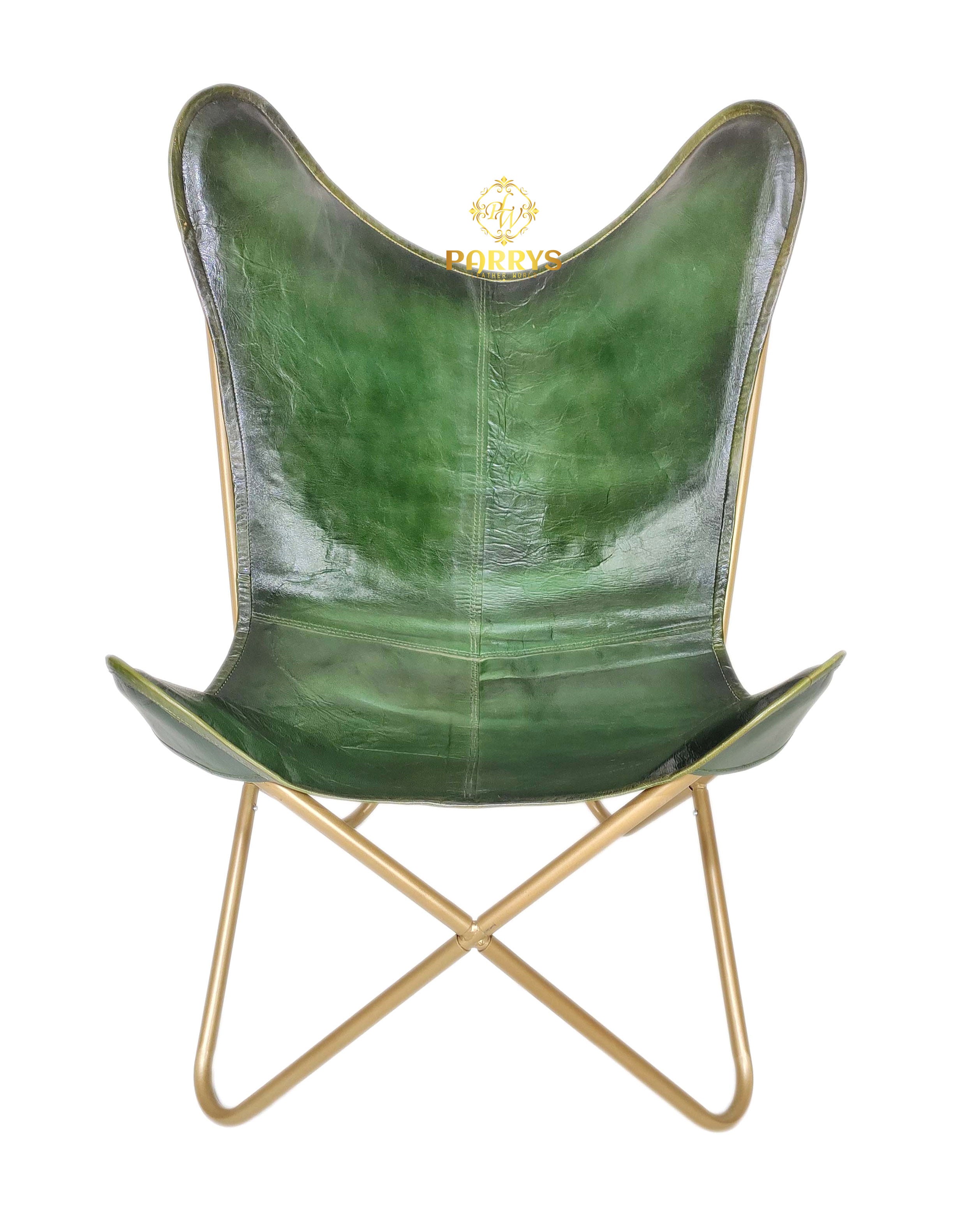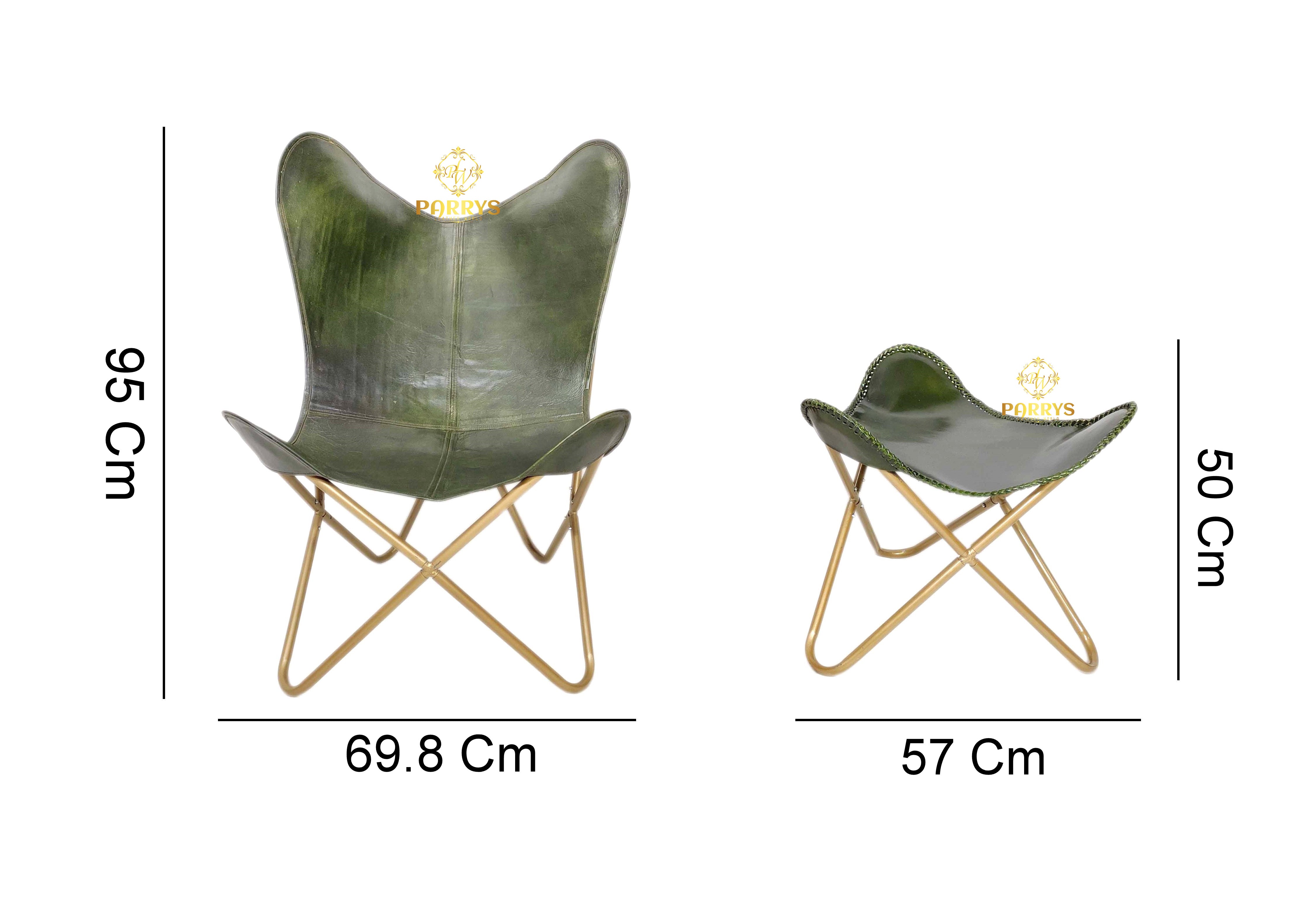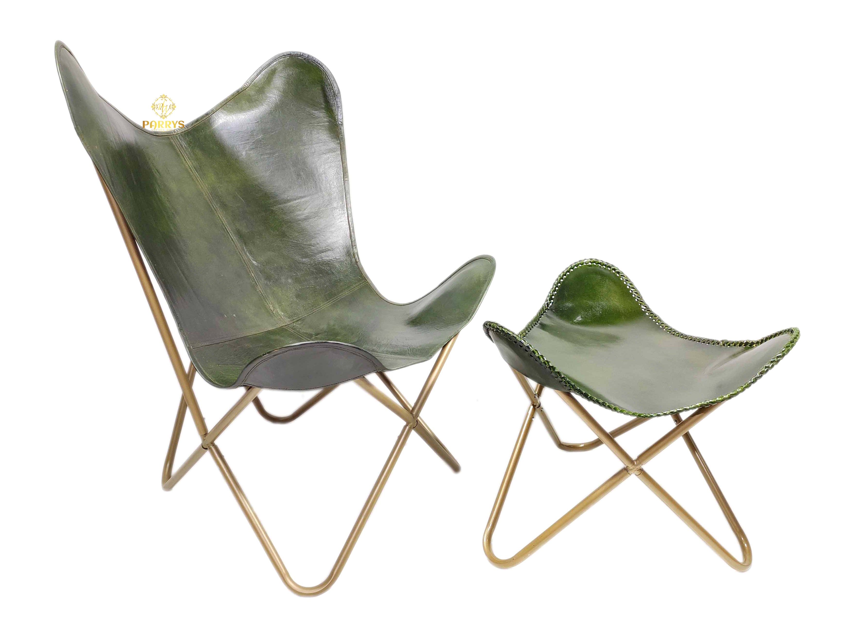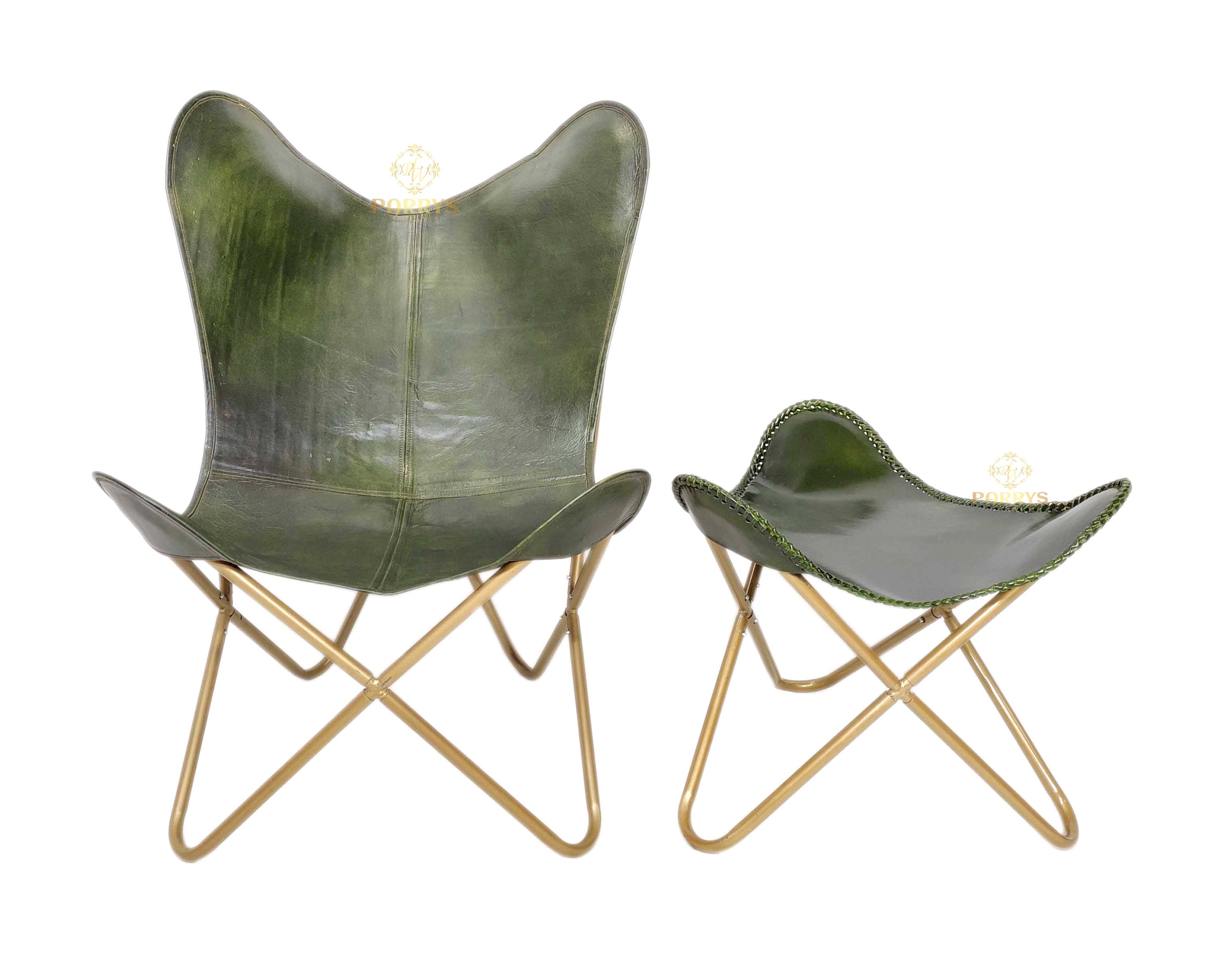 Earthy, refined, and lounge ready, the Moss Green Leather Chair & Ottoman pairs a rich moss green finish with warm brass tone bases for a grounded yet modern look. Handcrafted from premium top grain leather, both pieces display natural grain variation and a soft satin sheen that develops a graceful patina with everyday use. The ergonomic sling chair gently cradles the body, while the sculpted ottoman supports calves and feet for full body relaxation. Clean panel seams, decorative edge stitching, and crossed tubular frames keep the silhouette slim and architectural, making this set an easy fit for living rooms, reading corners, bedrooms, studios, and stylish office lounges.