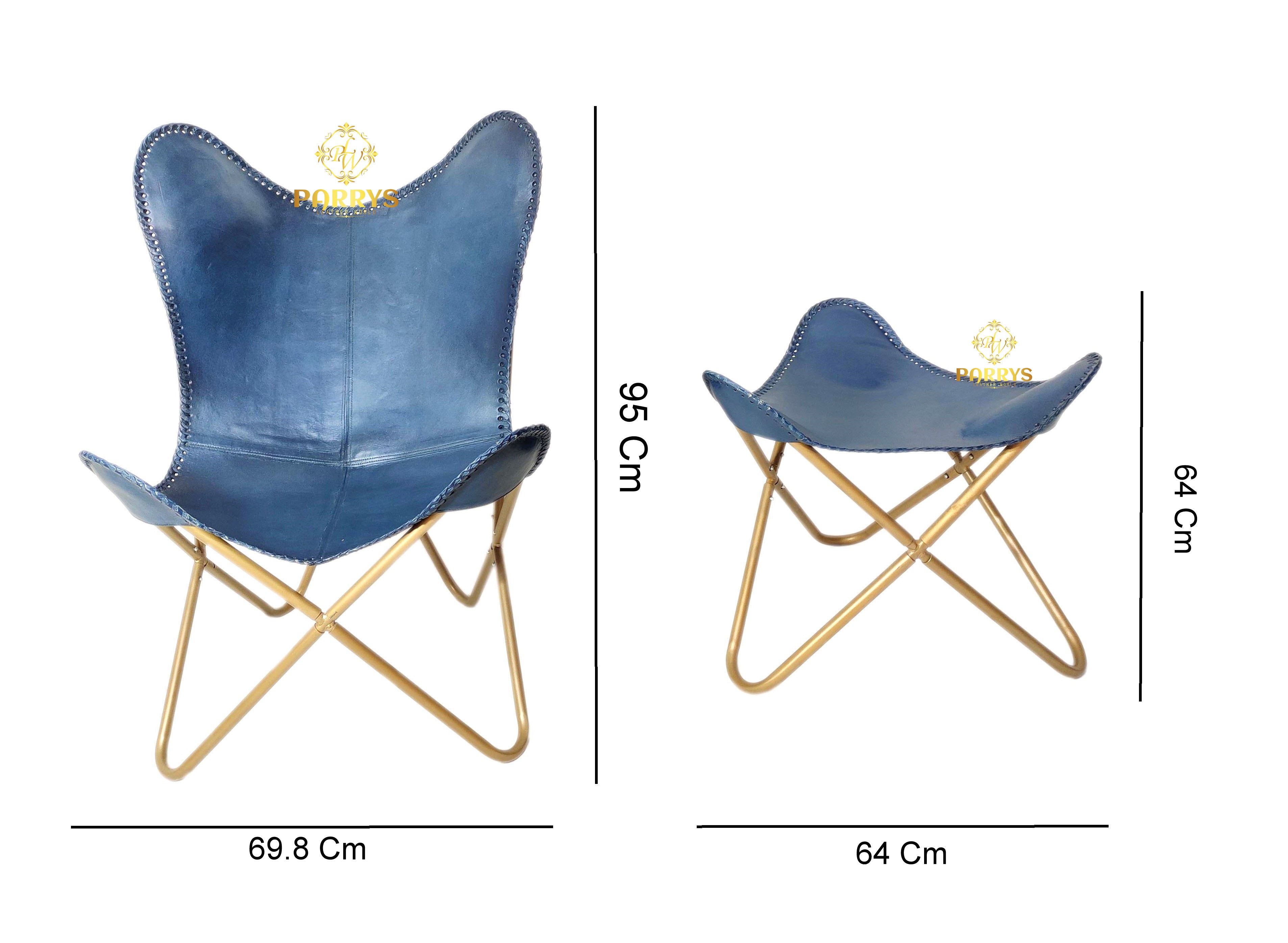 Cool toned, refined, and lounge ready, the Ocean Blue Leather Chair & Ottoman pairs a serene steel blue finish with warm brass tone bases for a coastal meets modern look. Handcrafted from premium top grain leather, both pieces show subtle color variation and a soft satin sheen that develops a graceful patina over time. The ergonomic sling chair gently cradles the body, while the sculpted ottoman supports calves and feet for full body relaxation. Neat edge stitching and clean panel seams highlight artisan craftsmanship, and the crossed tubular frames keep the silhouette slim and architectural. Ideal for living rooms, reading corners, bedrooms, studios, and sophisticated office lounges.