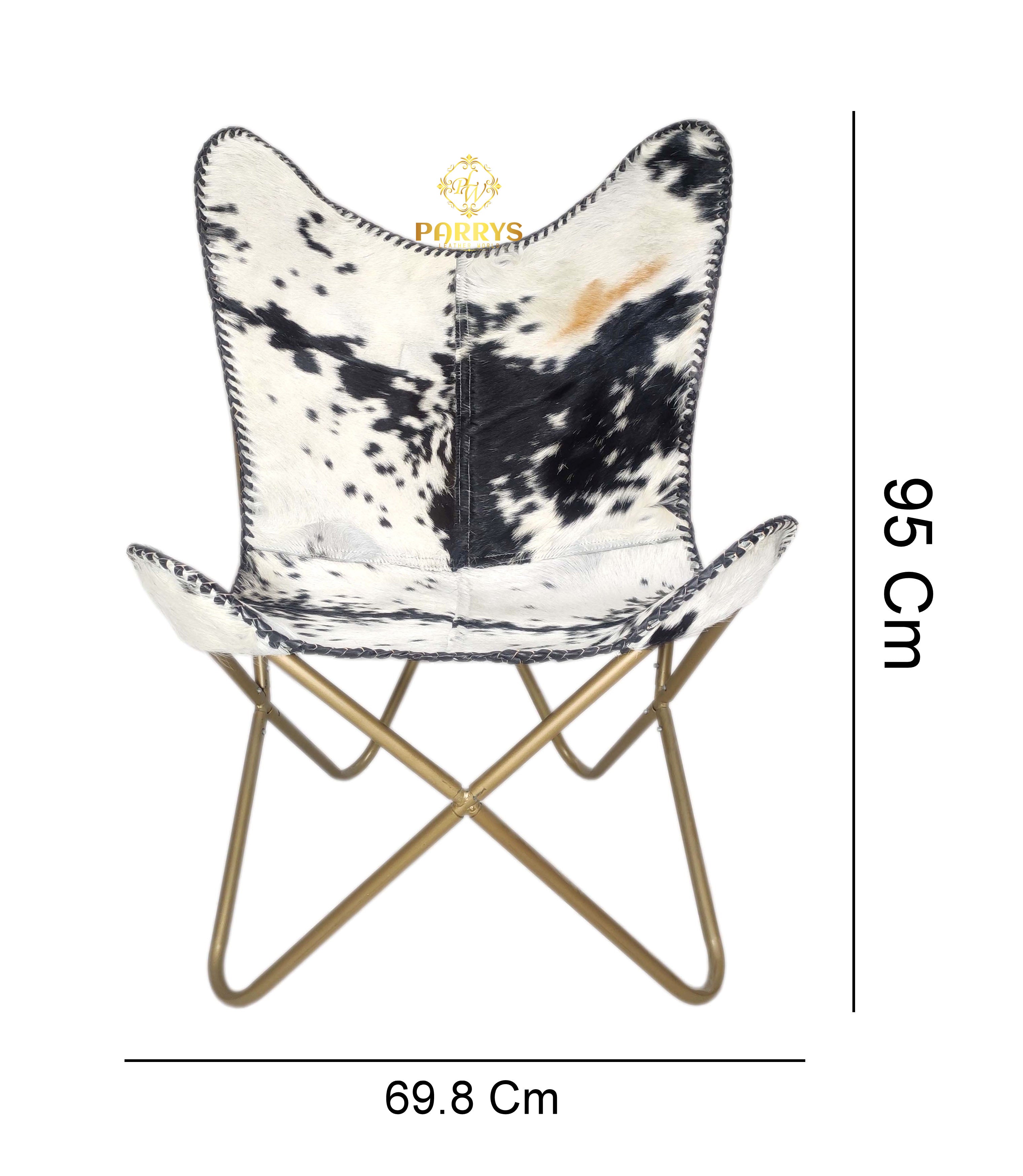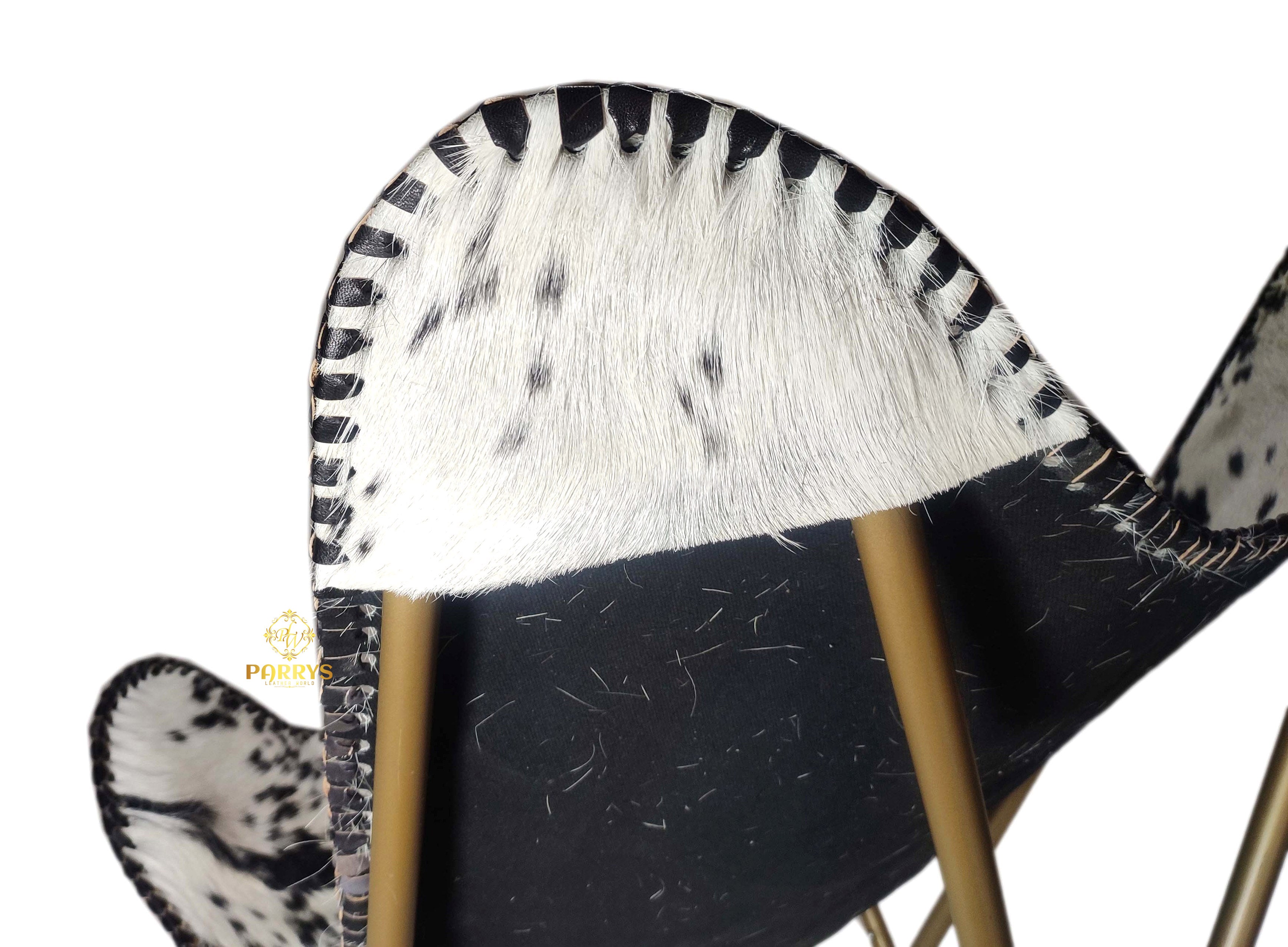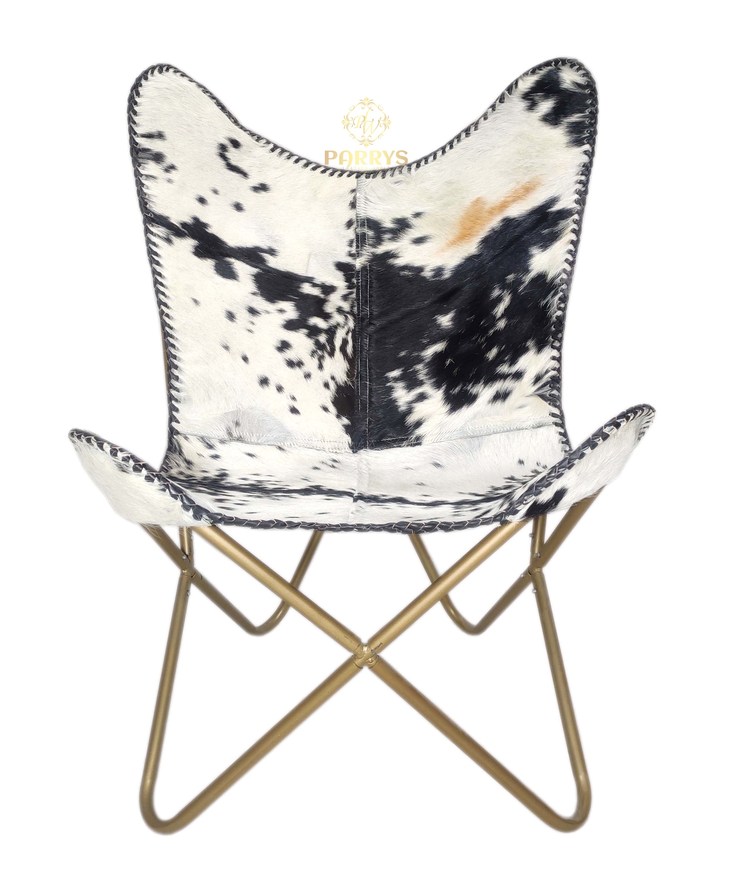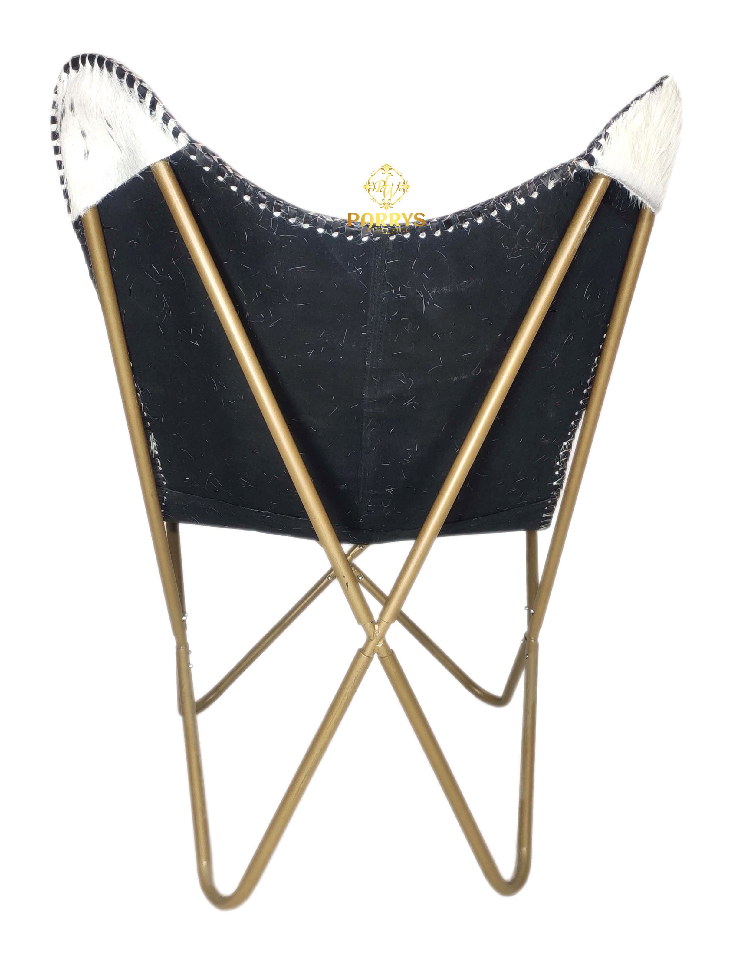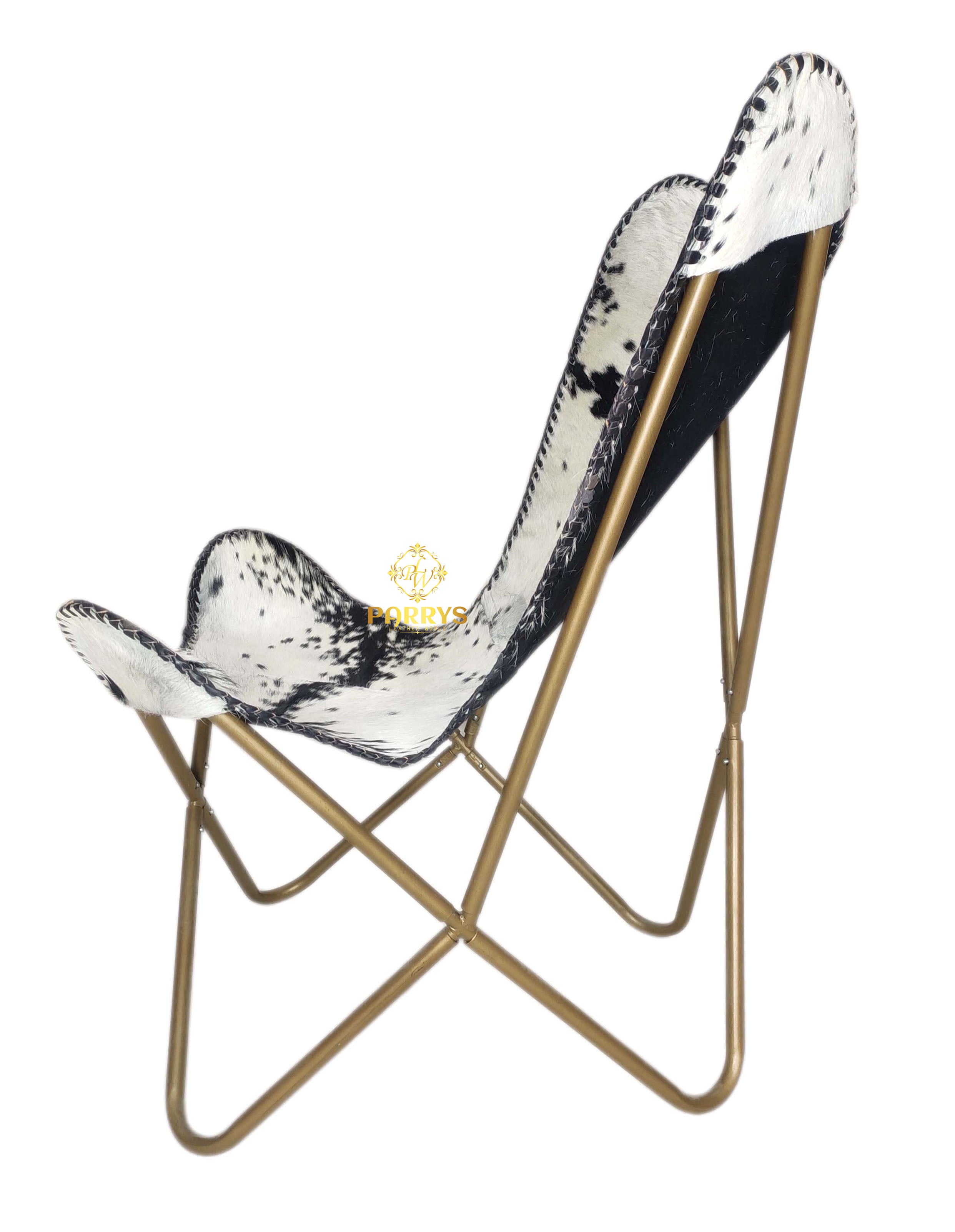 Striking and sculptural, the Black & White Brindle Cowhide Butterfly Chair delivers bold contrast and easy lounge comfort. Upholstered in authentic hair‑on cowhide, each chair showcases a one‑of‑a‑kind black‑and‑white brindle pattern, hand‑finished with leather whip‑stitch edging. The iconic butterfly silhouette cradles the body, while a brass‑toned cross frame keeps the profile airy yet sturdy perfect for modern, rustic, and eclectic spaces.