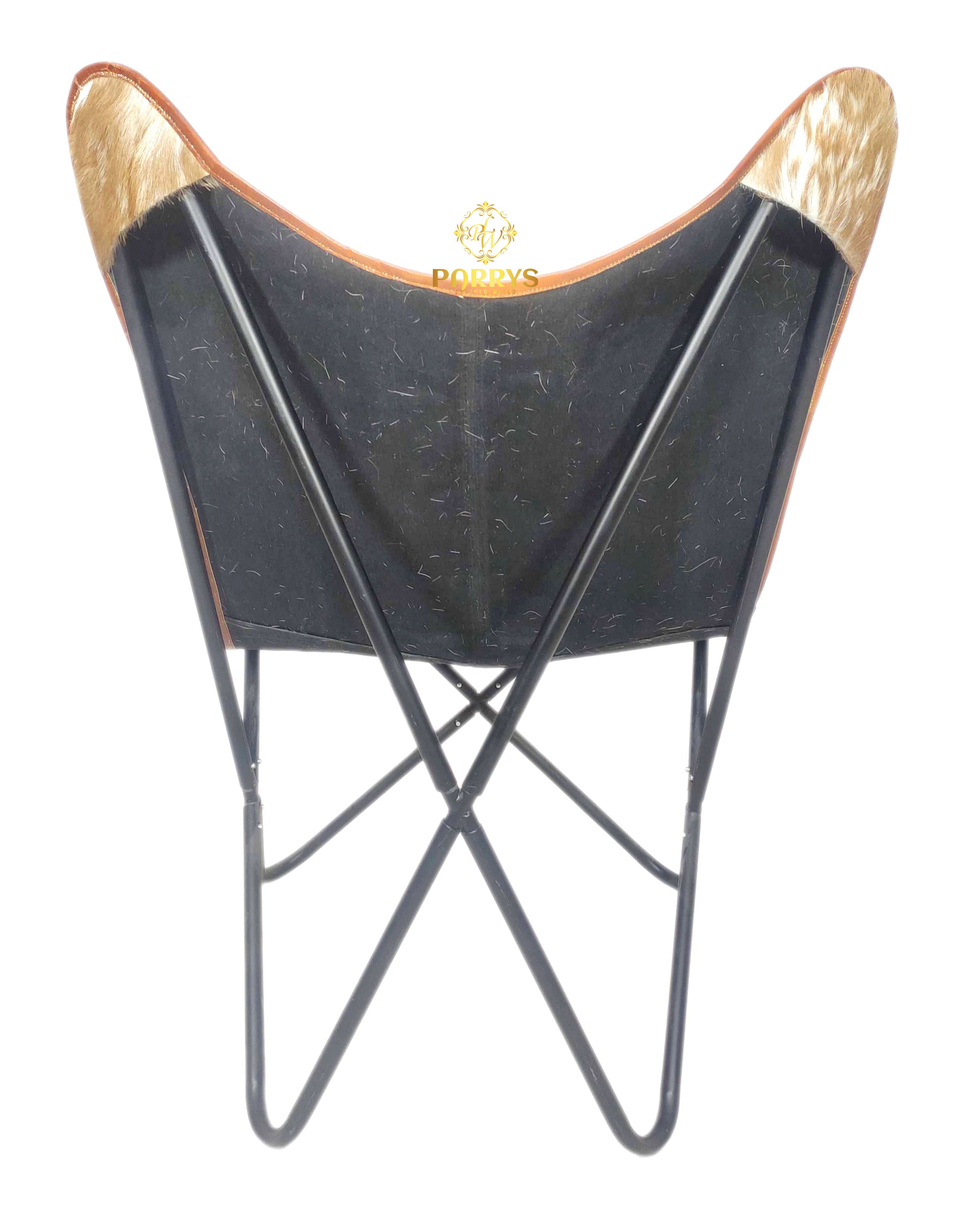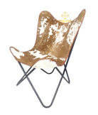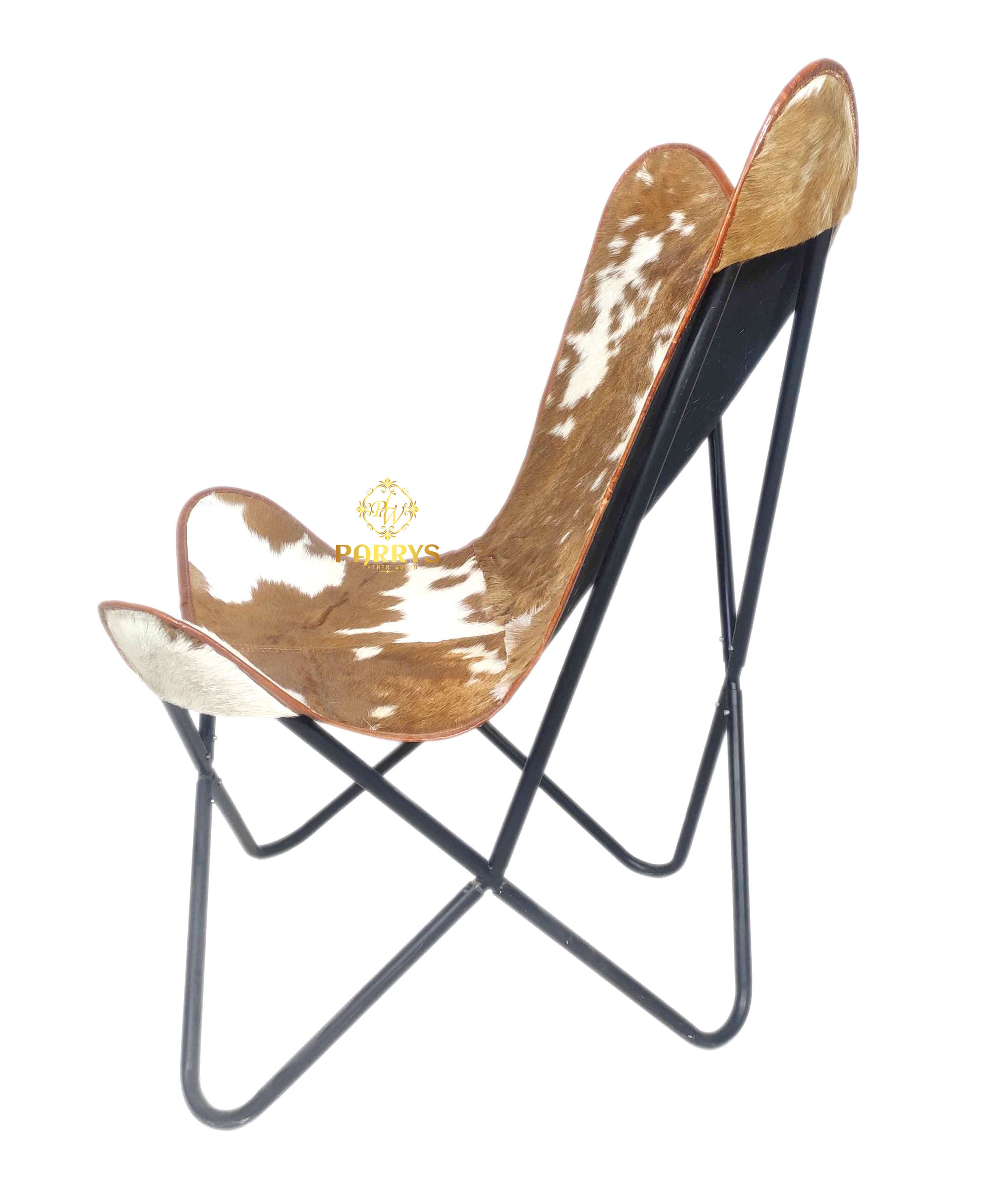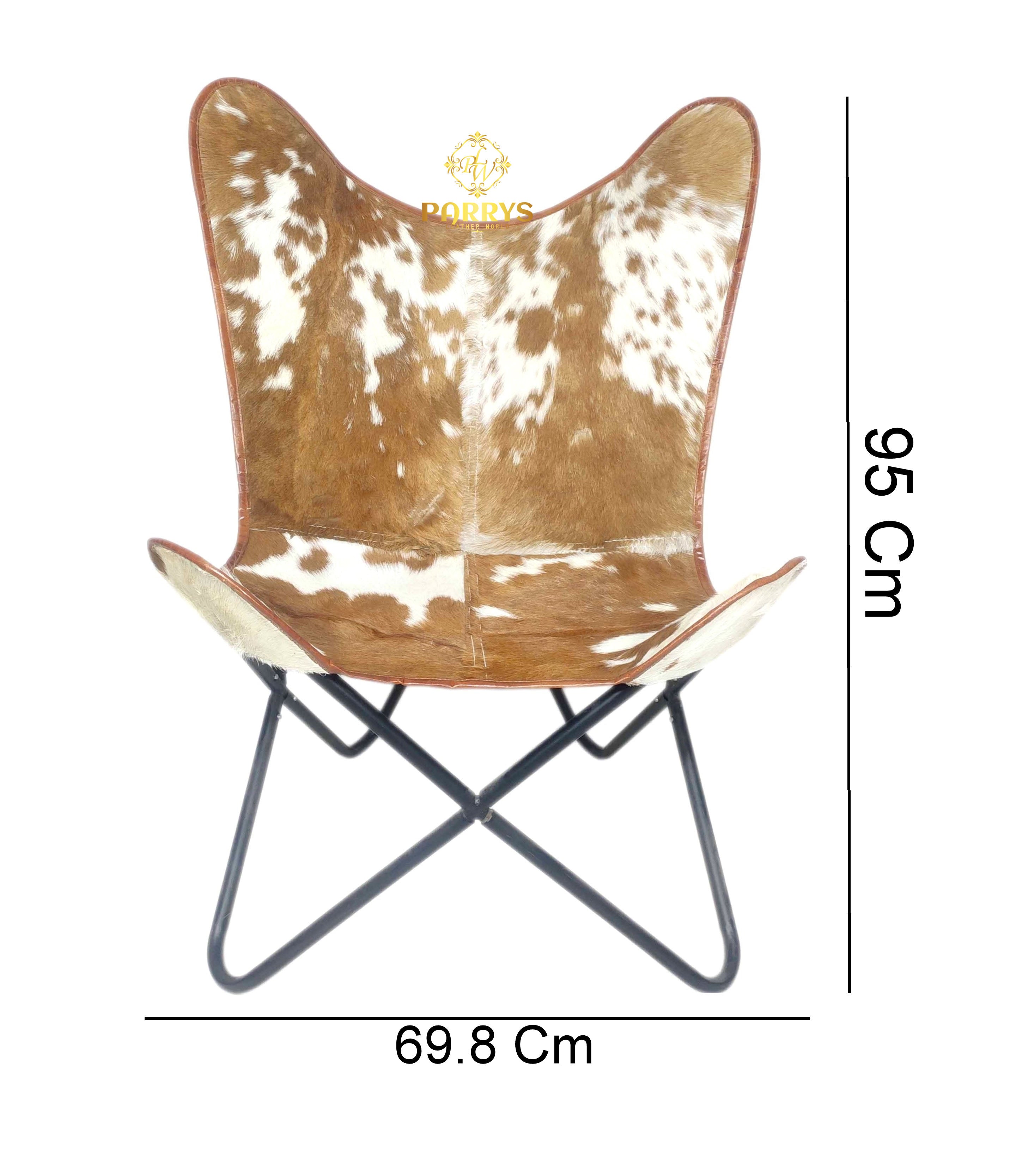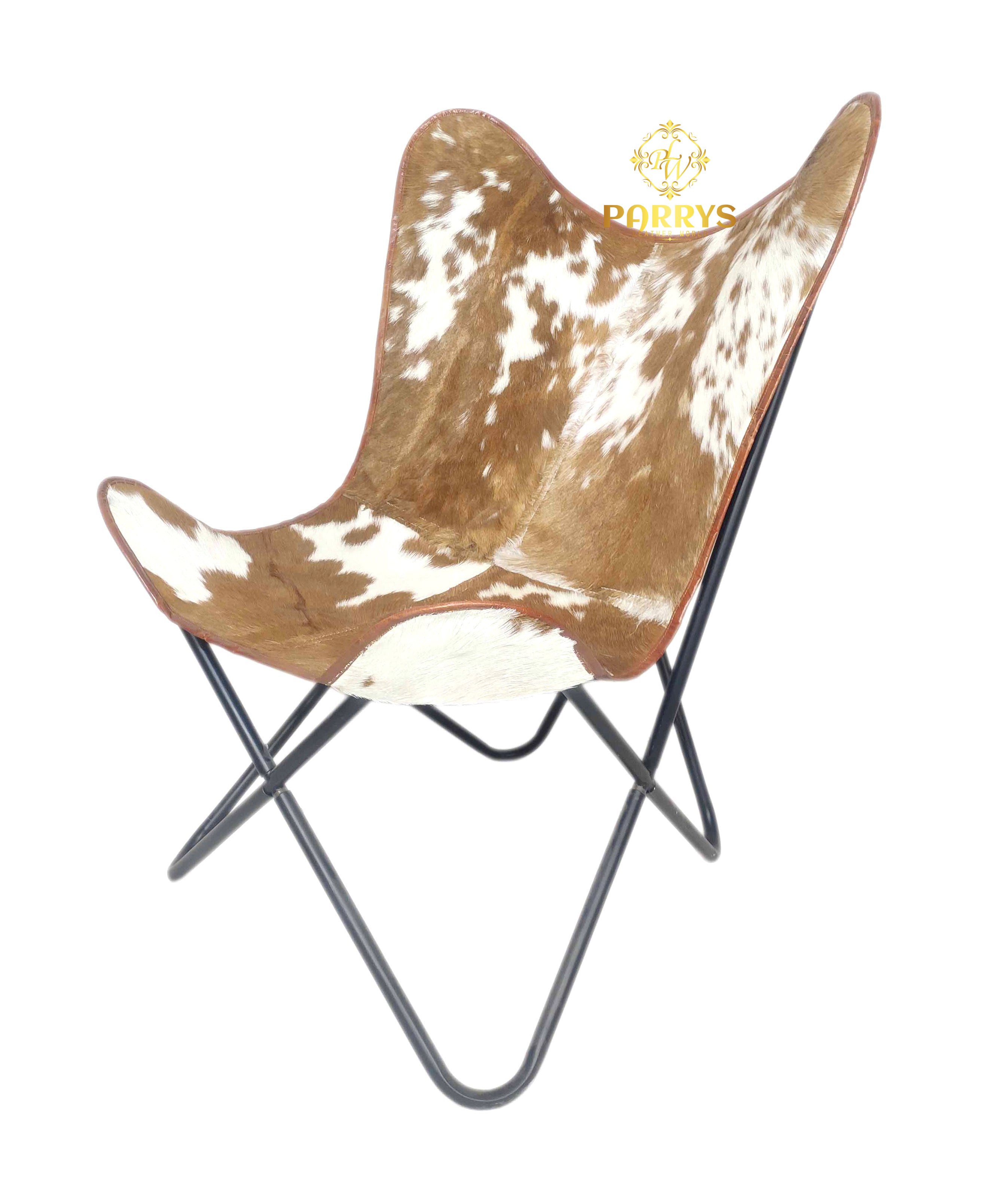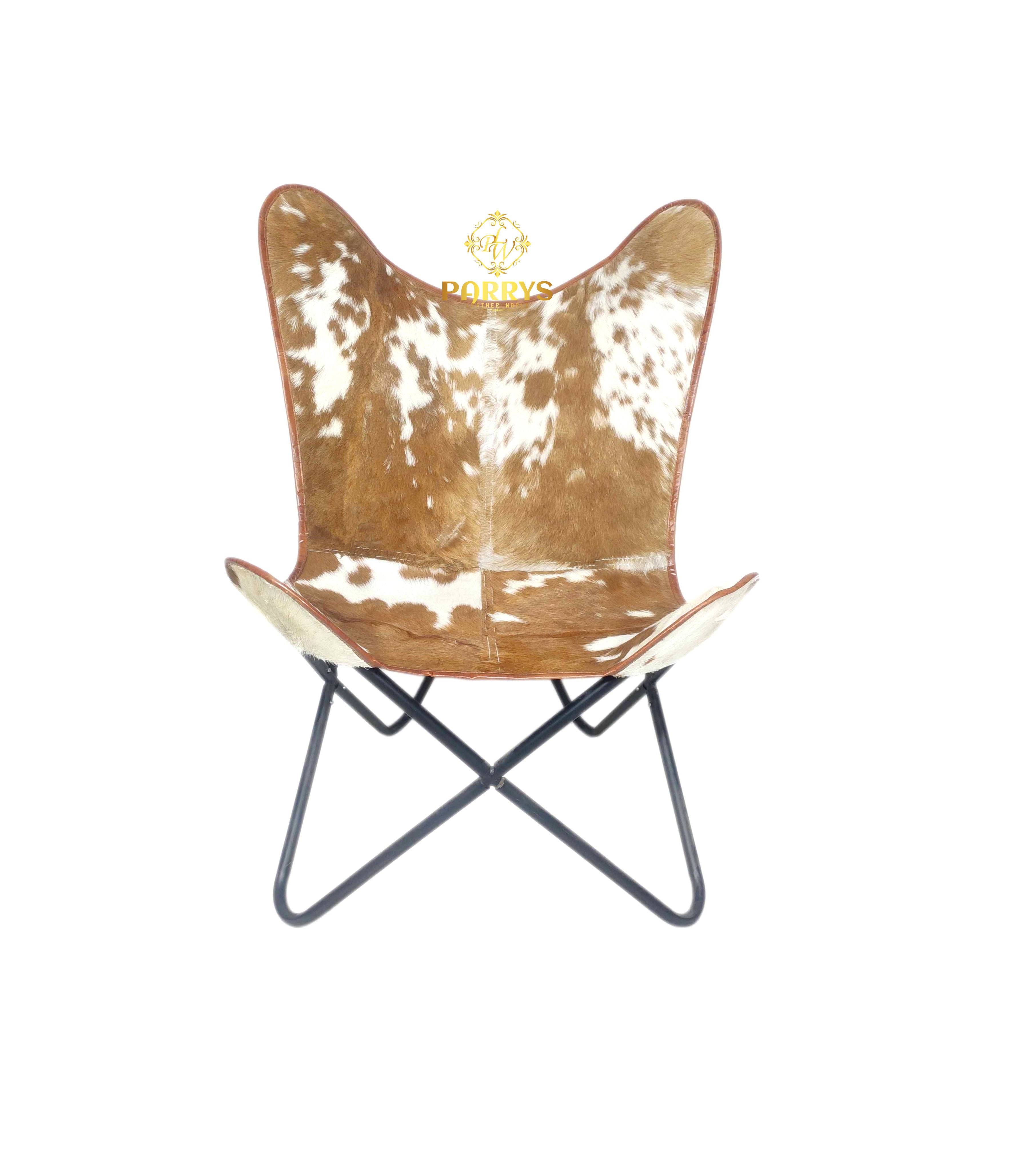 Elevate any room with the Heritage Brown-White Cowhide Butterfly Chair. Handcrafted from premium hair-on cowhide, every seat showcases a naturally unique brown-and-white pattern no two chairs are alike. The iconic butterfly silhouette cradles the body for relaxed, lounge worthy comfort, while a sleek powder-coated iron frame lends minimalist style and sturdy support. Finished with leather-bound edges and hand-laced detailing, this piece brings rustic character and refined craftsmanship to living rooms, reading corners, studios, and chic loft spaces.