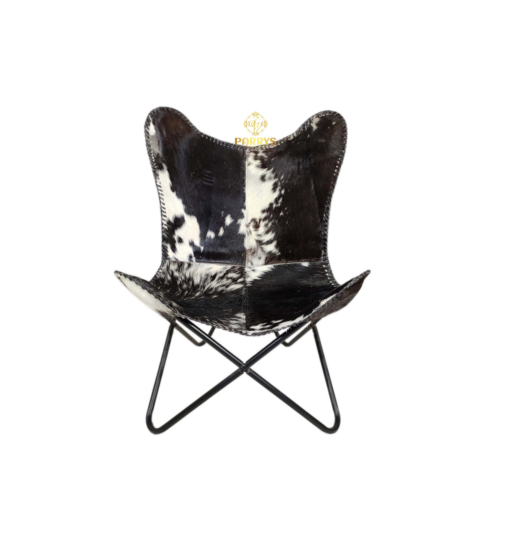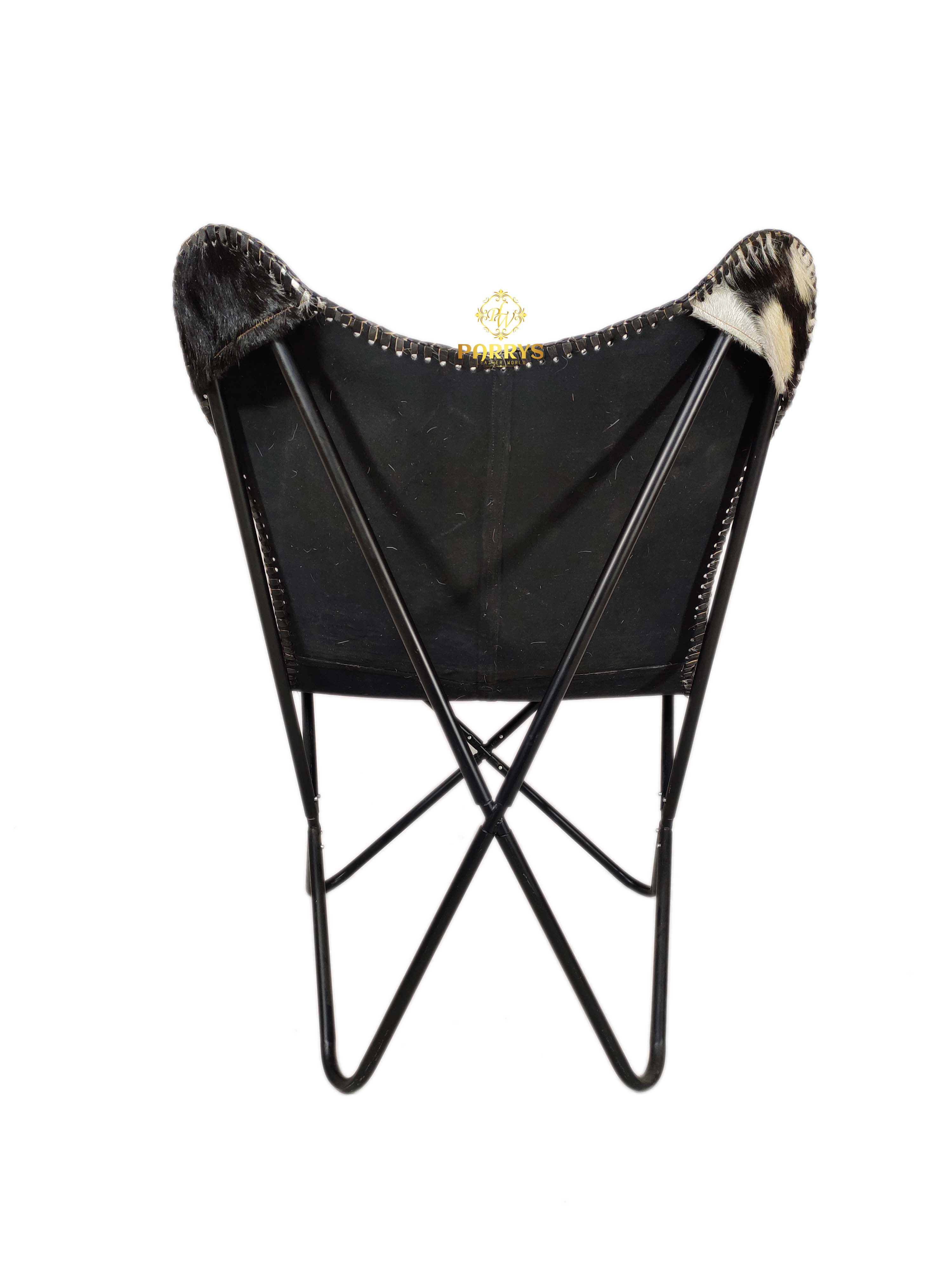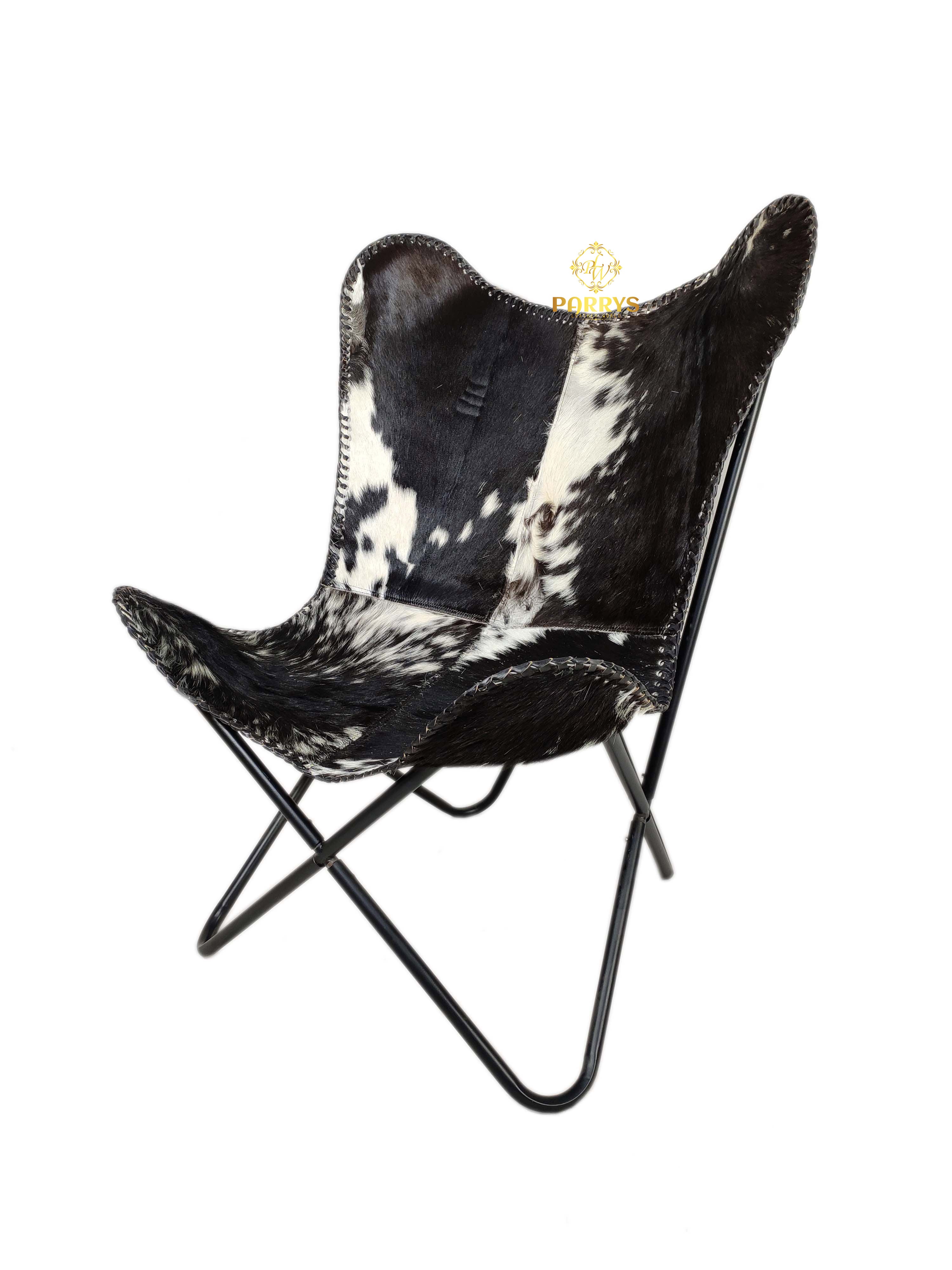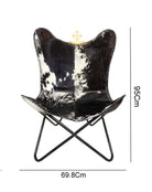 The Midnight Dapple Cowhide Butterfly Chair blends rustic charm with contemporary elegance, making it a statement piece for any home. Handcrafted from premium Cowhide leather, its naturally dappled black-and-white pattern ensures that no two chairs are exactly alike. The iconic butterfly silhouette provides relaxed, ergonomic seating, while the sturdy iron frame offers lasting durability. Perfect for adding a touch of texture and luxury to living rooms, reading nooks, or patios, this chair is as comfortable as it is eye-catching.