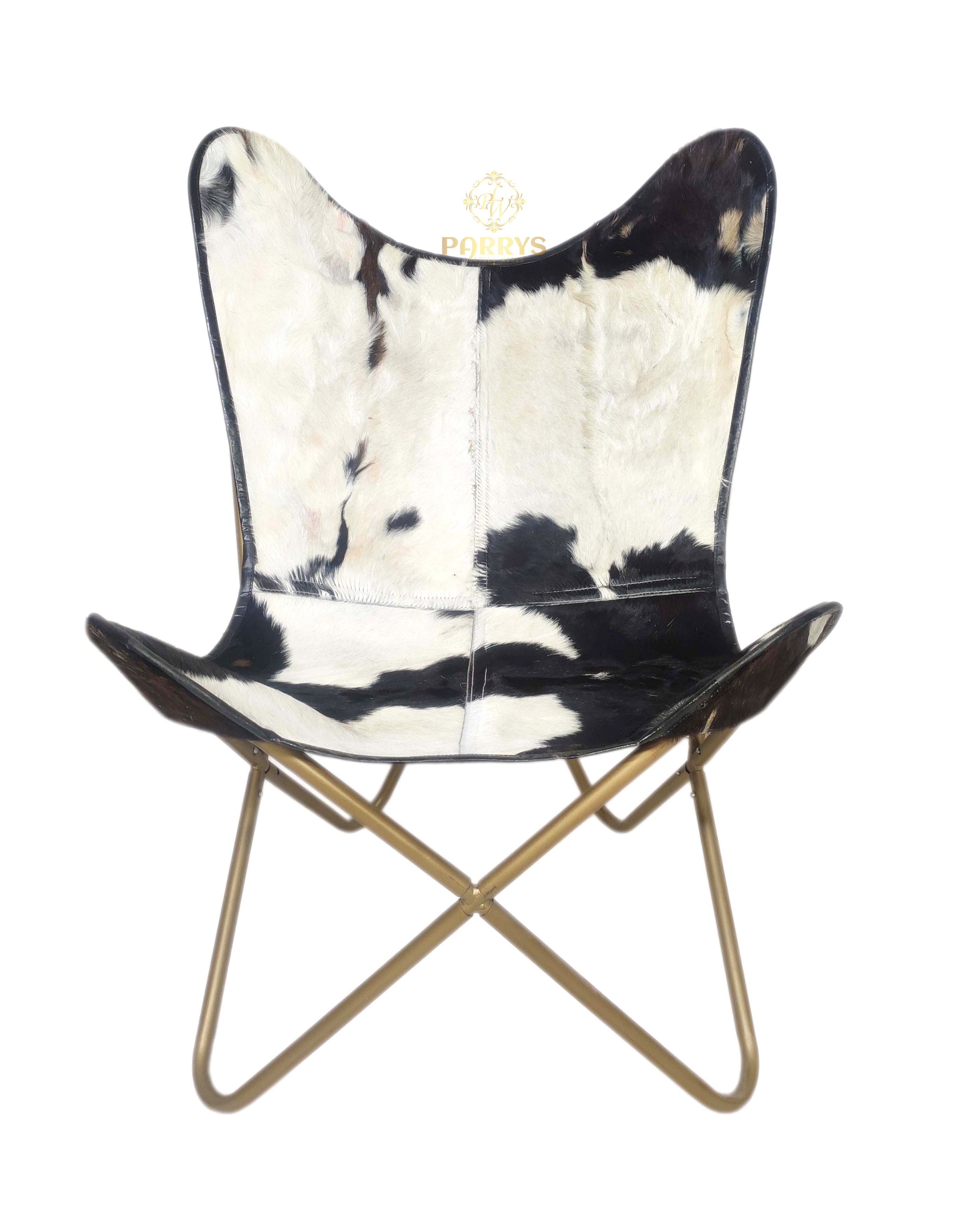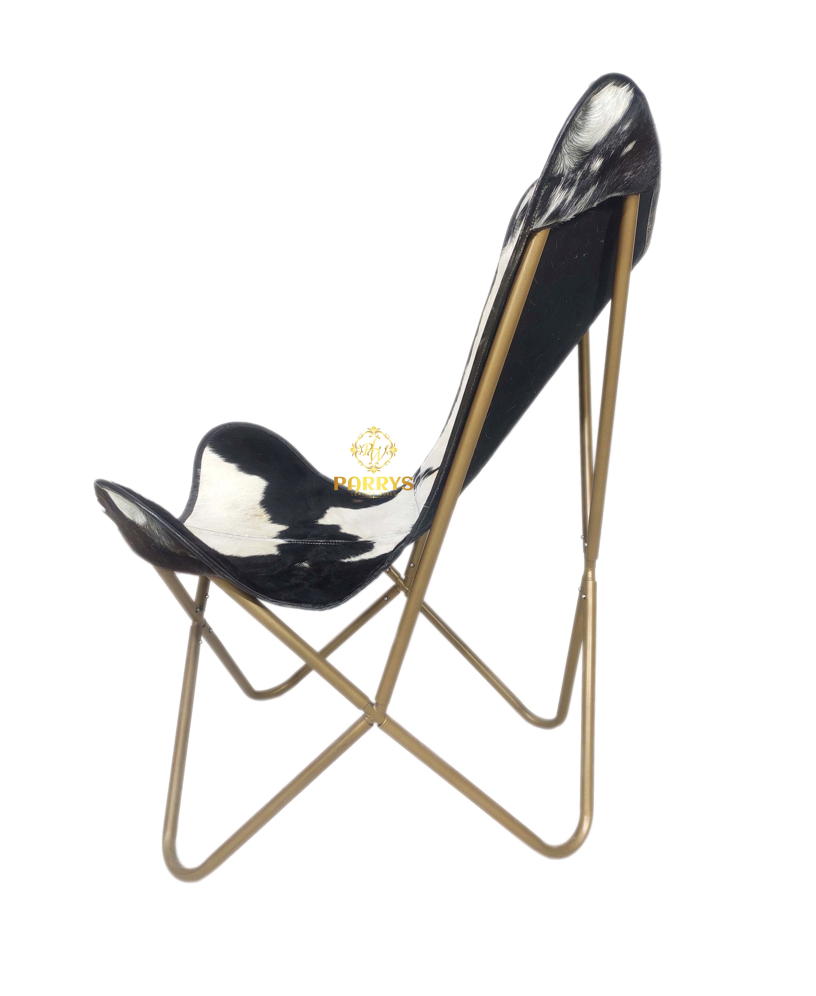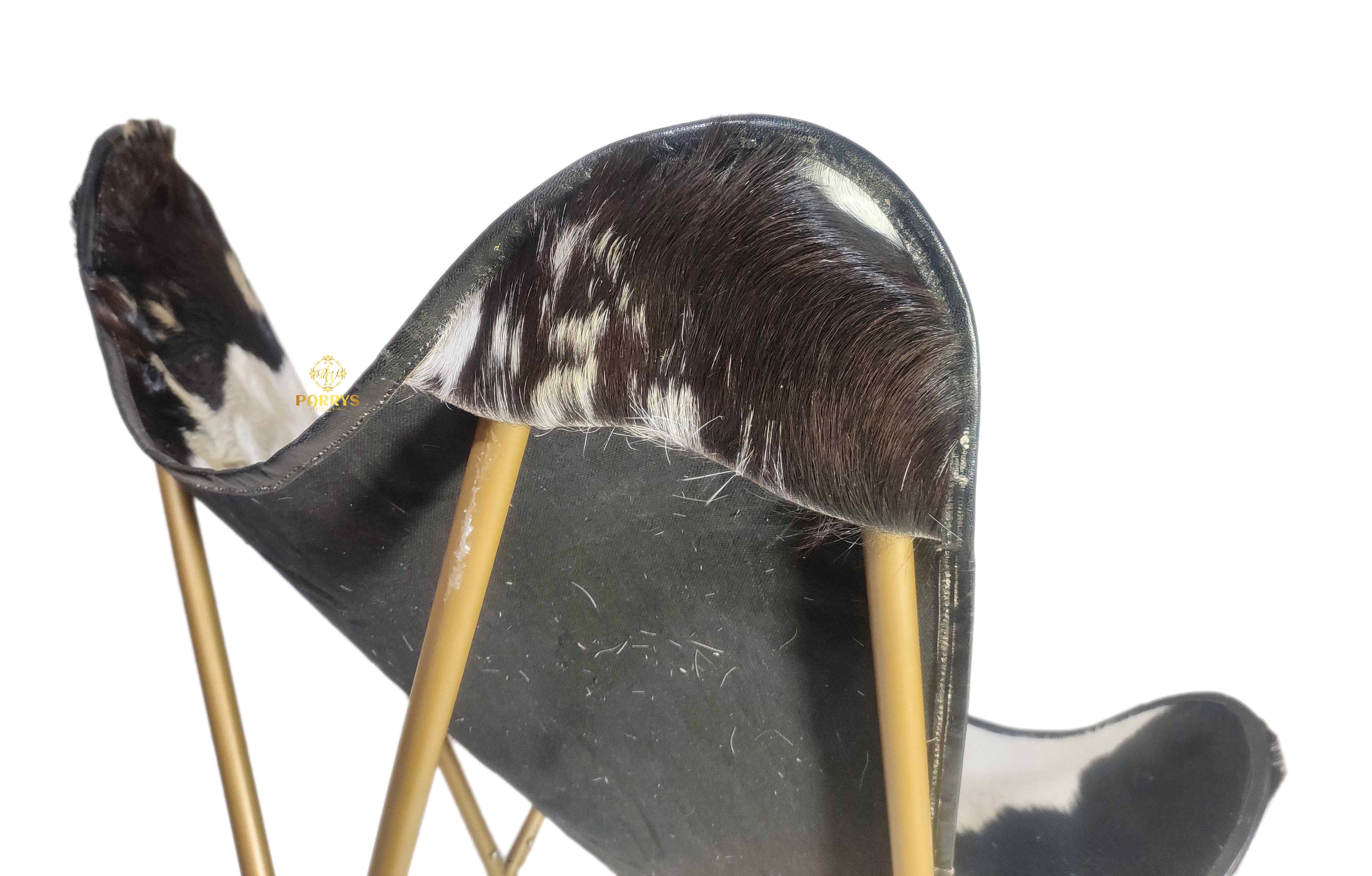 Playful yet sophisticated, the Panda Patch Cowhide Butterfly Chair showcases bold black‑and‑ivory patches reminiscent of a panda’s coat. Upholstered in authentic hair‑on cowhide and finished with smooth leather edging, each chair is uniquely patterned. The iconic butterfly silhouette gently cradles the body, while a brass‑toned cross frame keeps the look airy yet sturdy perfect for modern, eclectic, and rustic interiors.