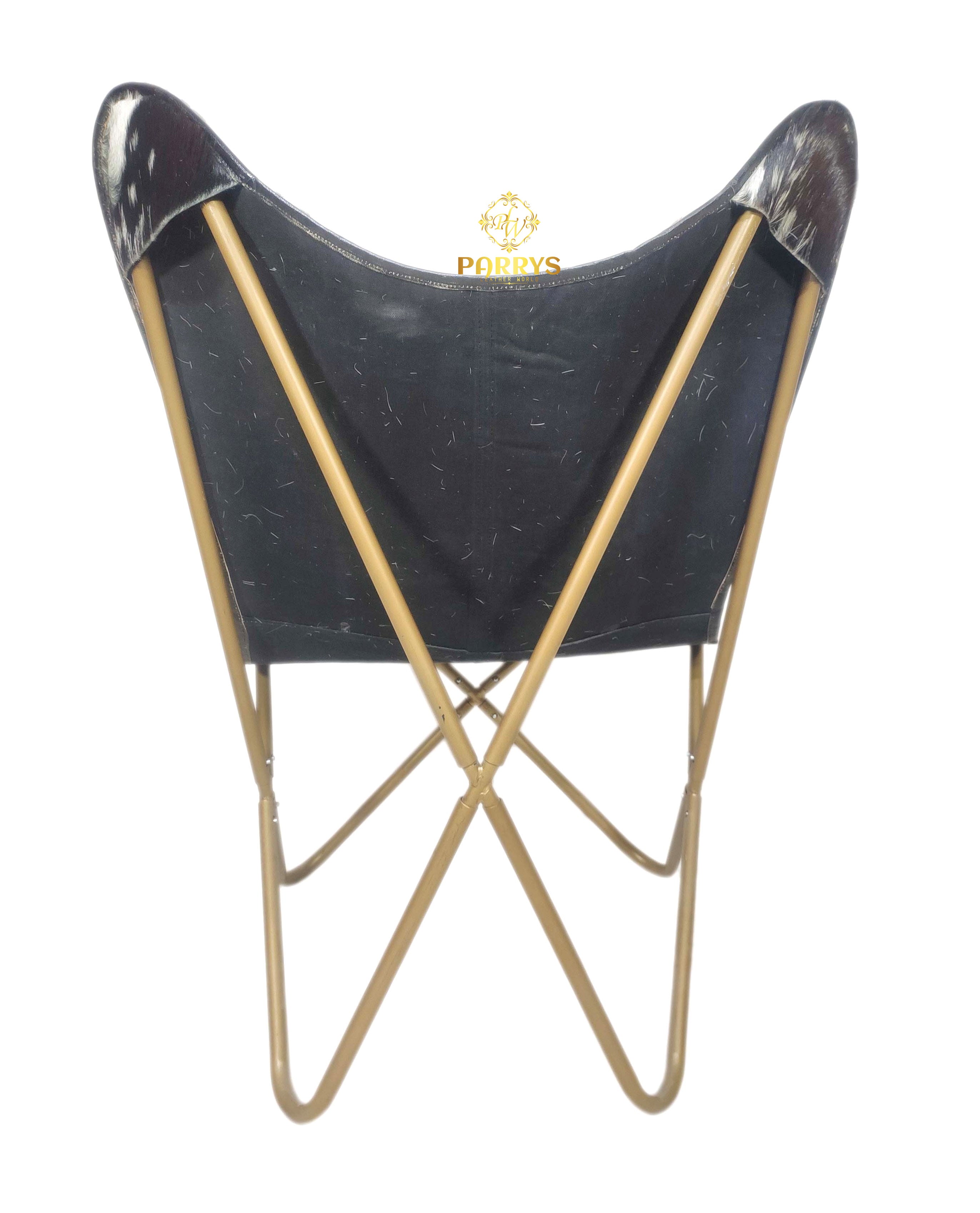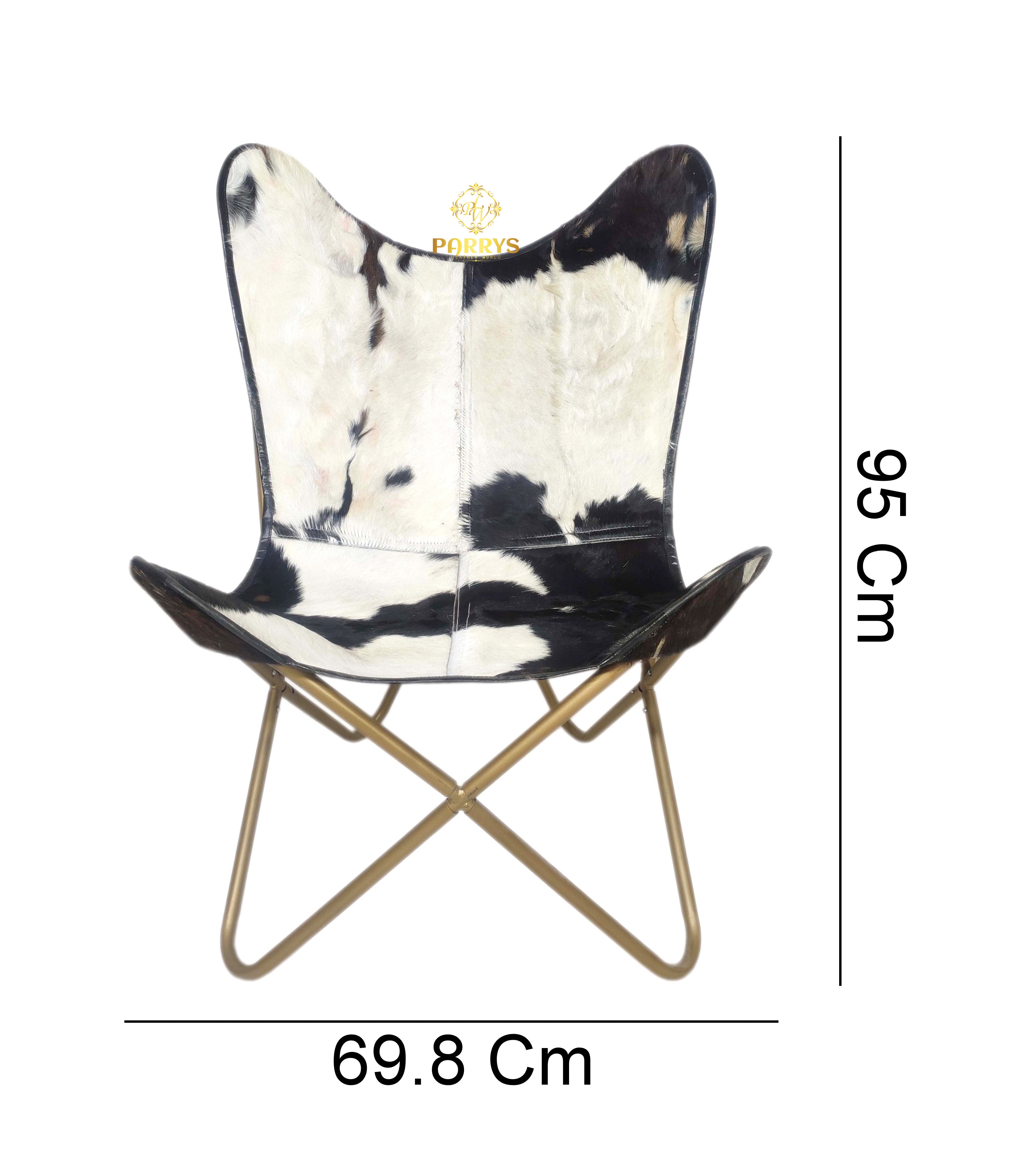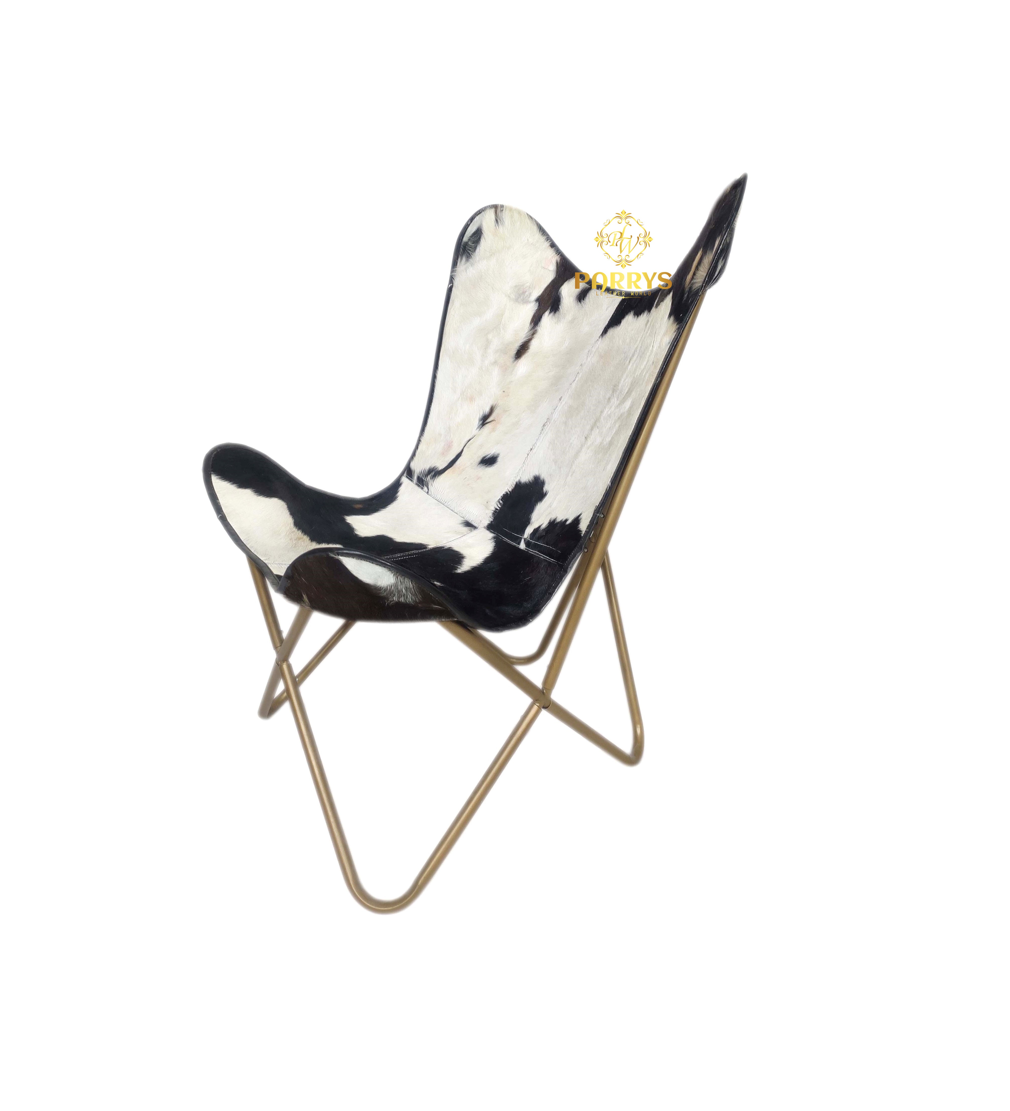 Playful yet sophisticated, the Panda Patch Cowhide Butterfly Chair showcases bold black‑and‑ivory patches reminiscent of a panda’s coat. Upholstered in authentic hair‑on cowhide and finished with smooth leather edging, each chair is uniquely patterned. The iconic butterfly silhouette gently cradles the body, while a brass‑toned cross frame keeps the look airy yet sturdy perfect for modern, eclectic, and rustic interiors.