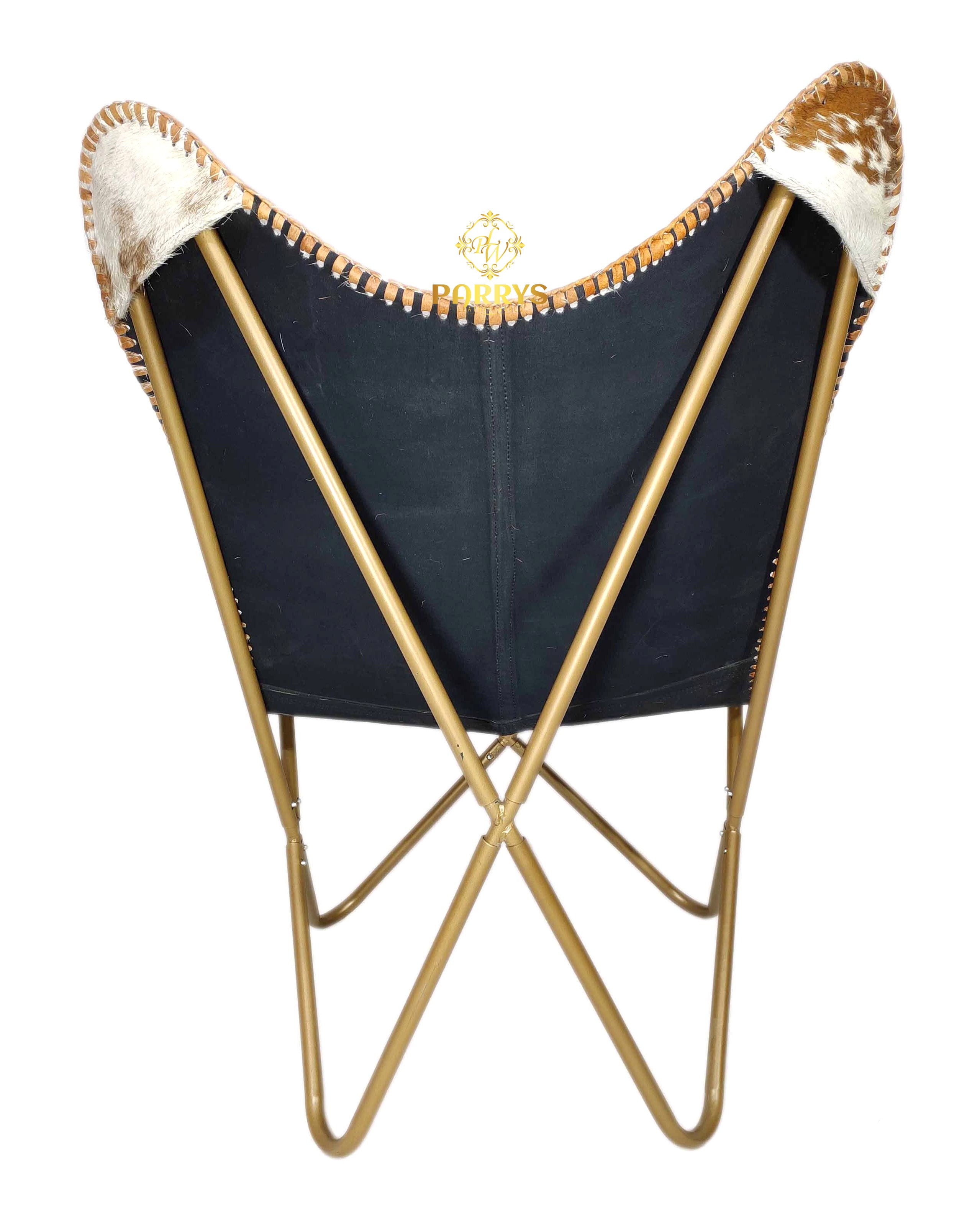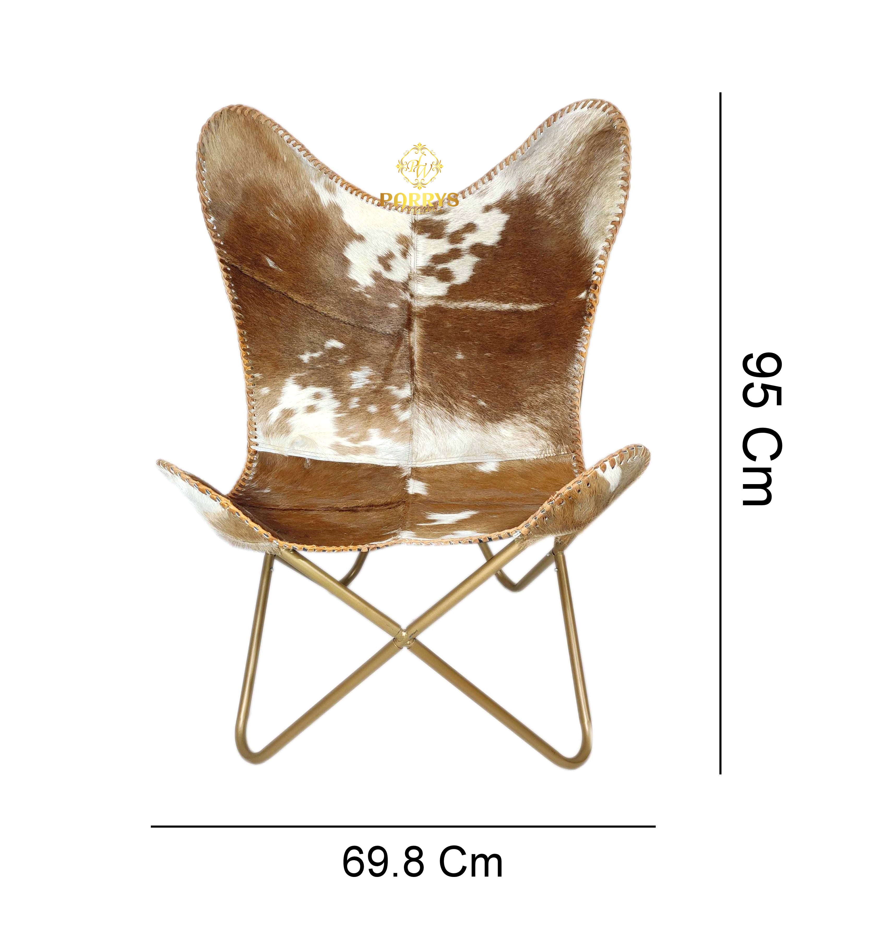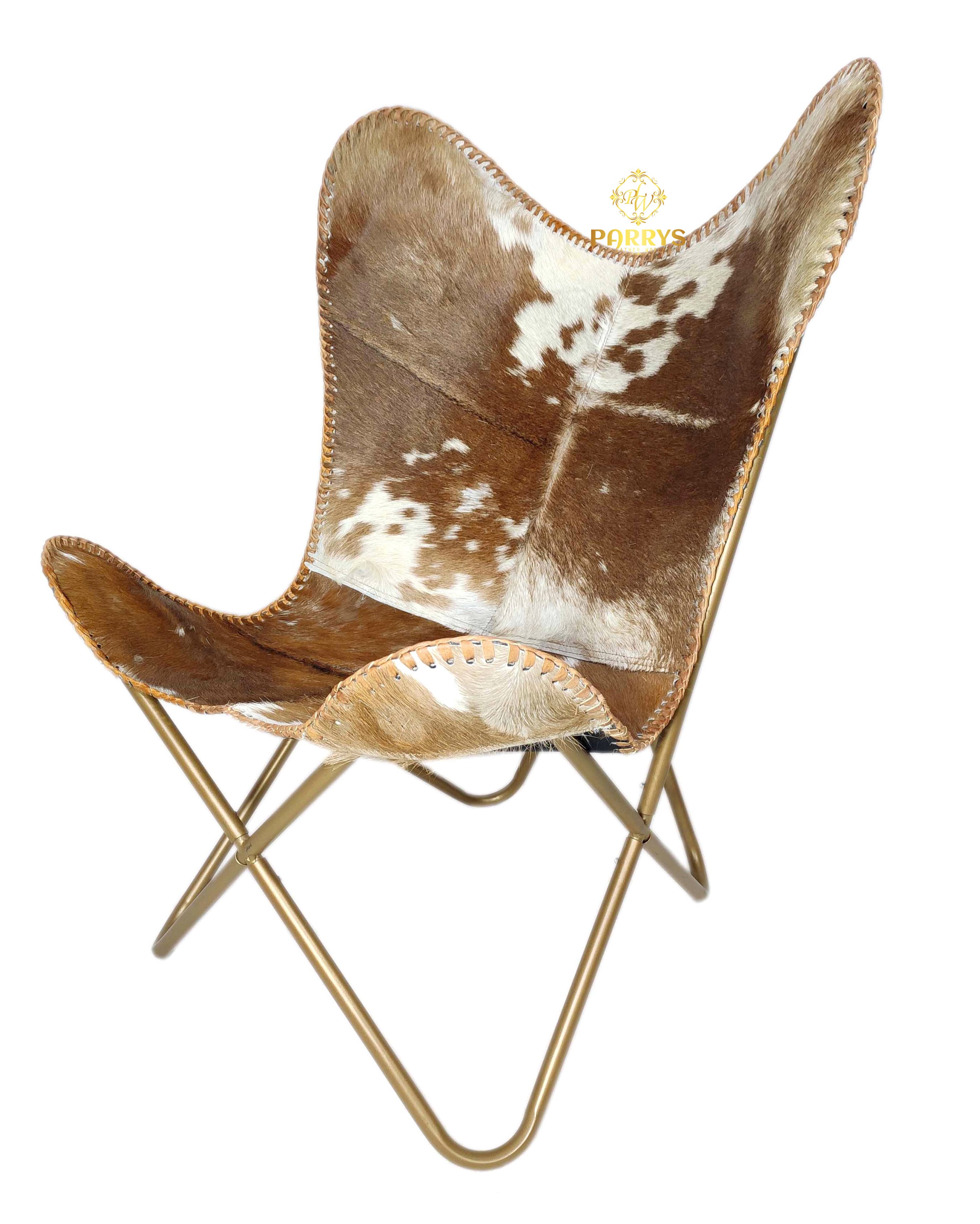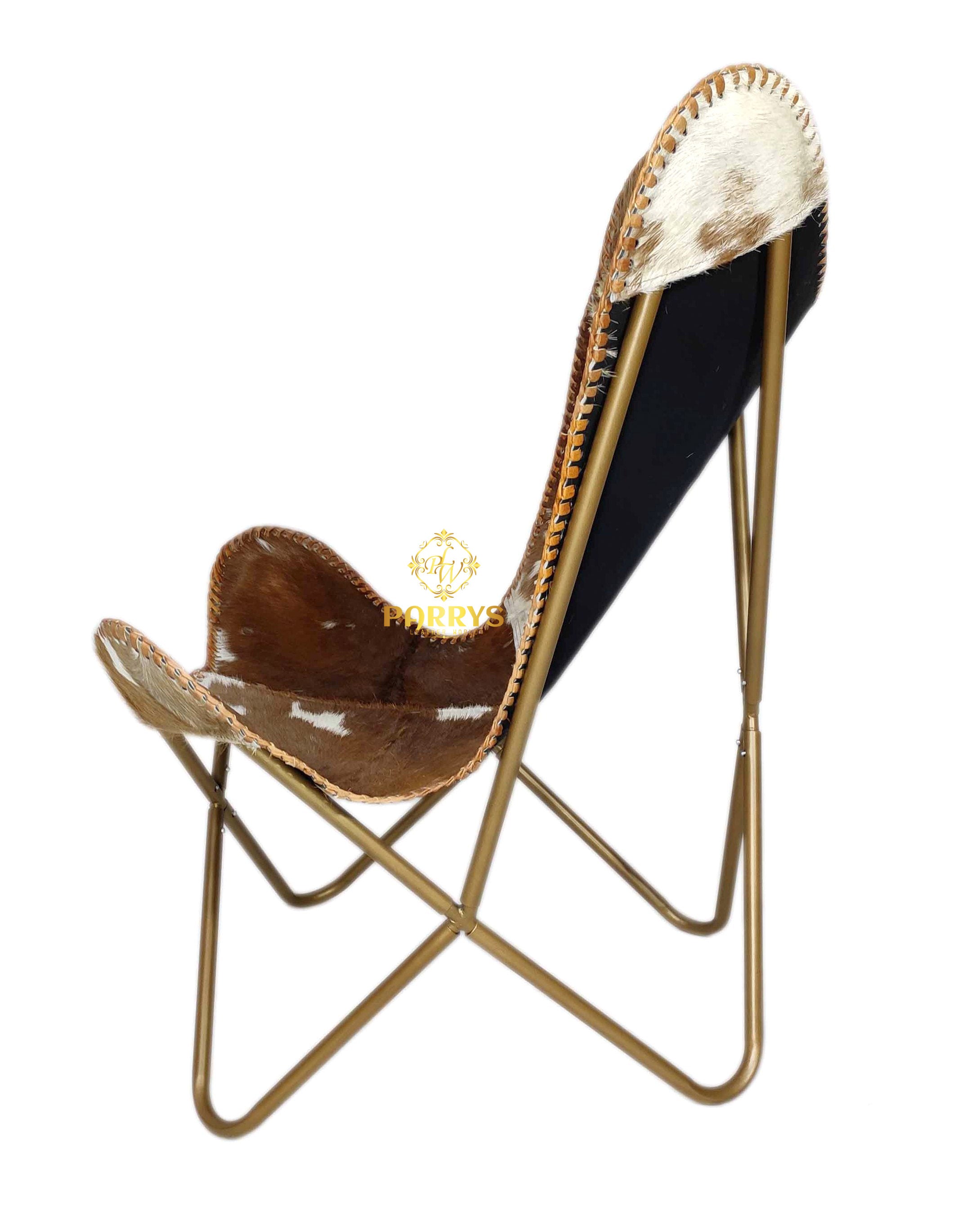 Rich and rustic, the Saddle Splash Cowhide Butterfly Chair brings authentic Western charm to any space. Upholstered in genuine hair‑on cowhide, it showcases warm saddle brown tones splashed with creamy ivory patches and natural markings. Hand‑finished with leather whip‑stitch edging, each chair celebrates the unique beauty of natural hide patterns. The iconic butterfly silhouette gently cradles the body, while a brass‑toned cross frame keeps the look sculptural yet sturdy. Perfect for ranch, rustic modern, an