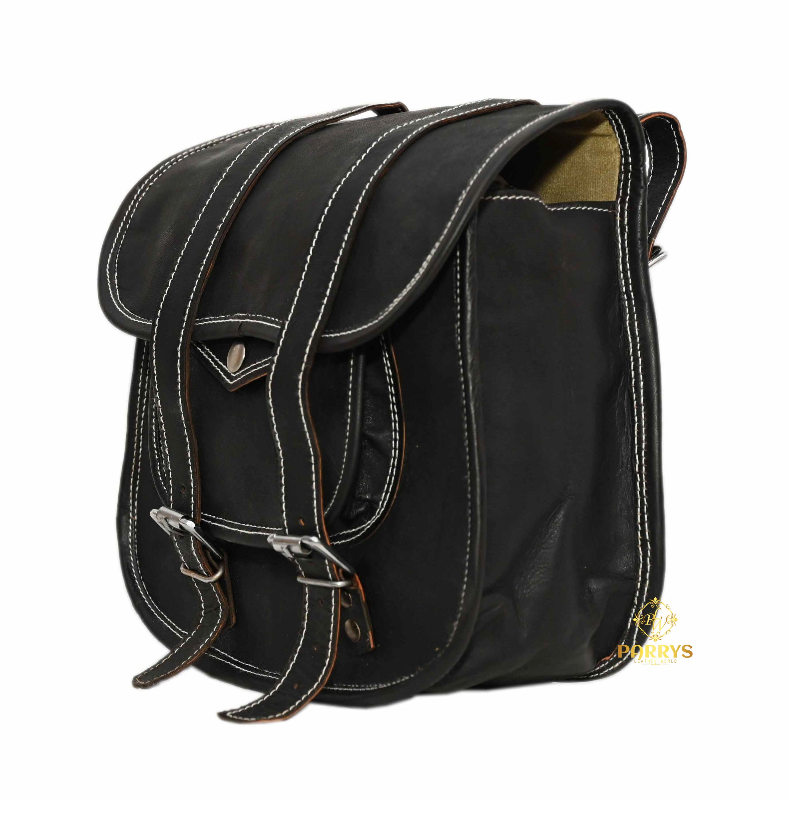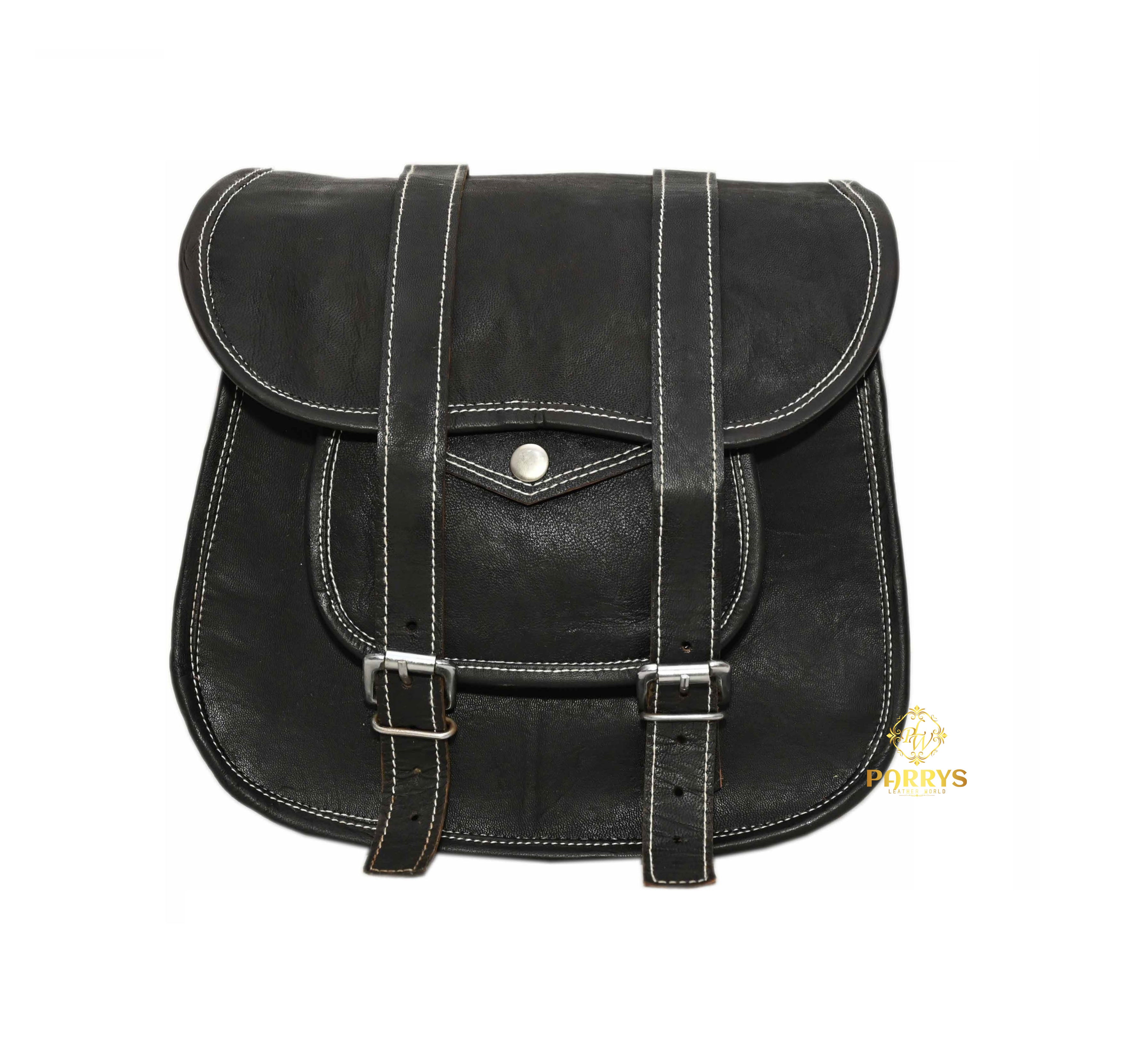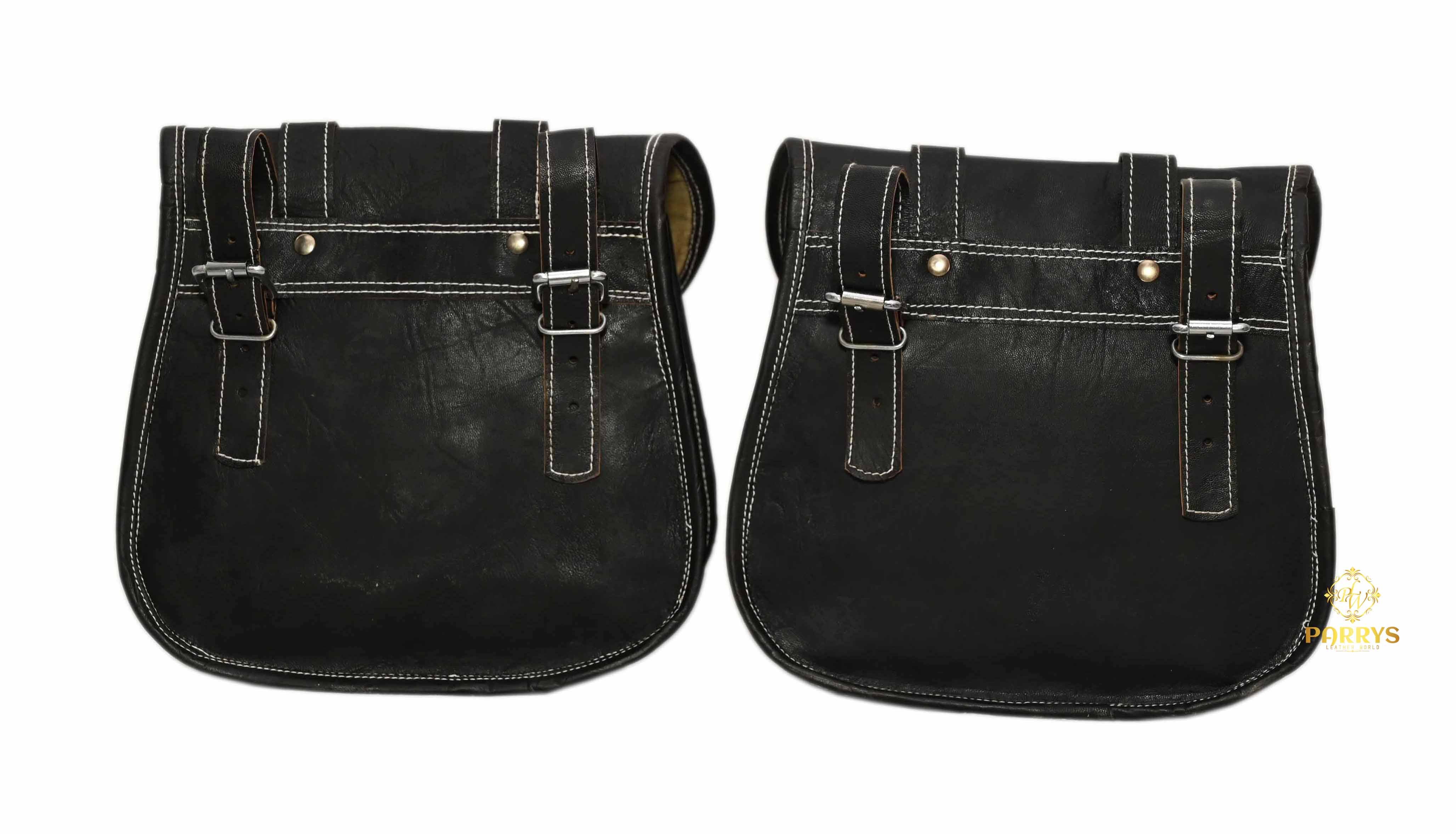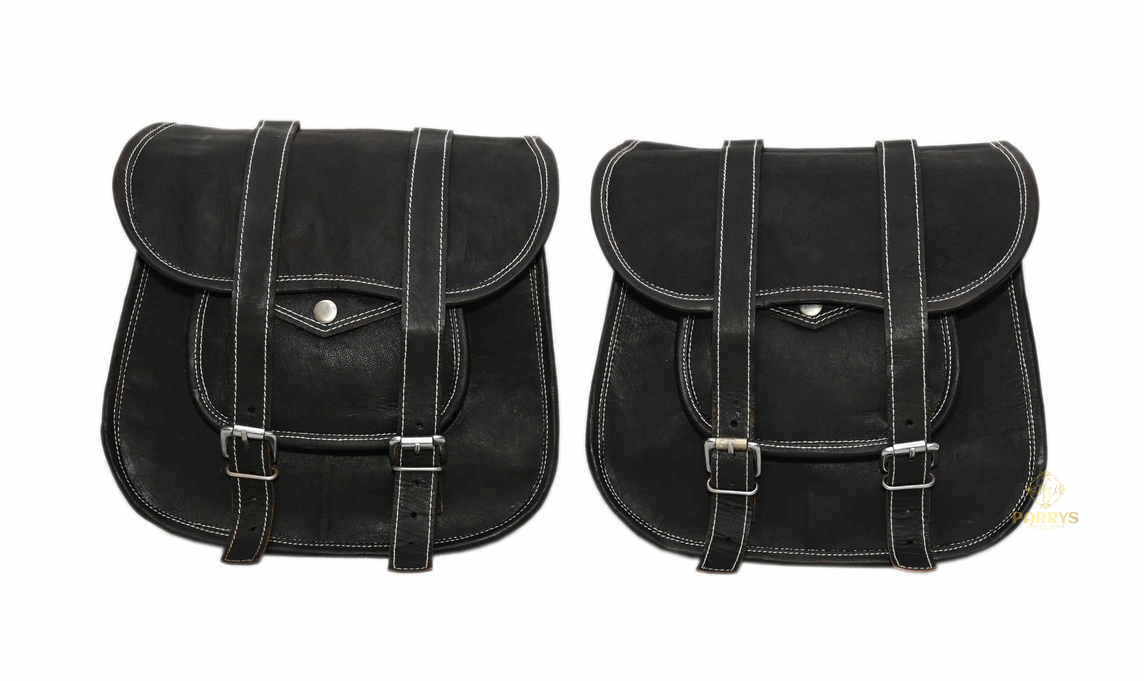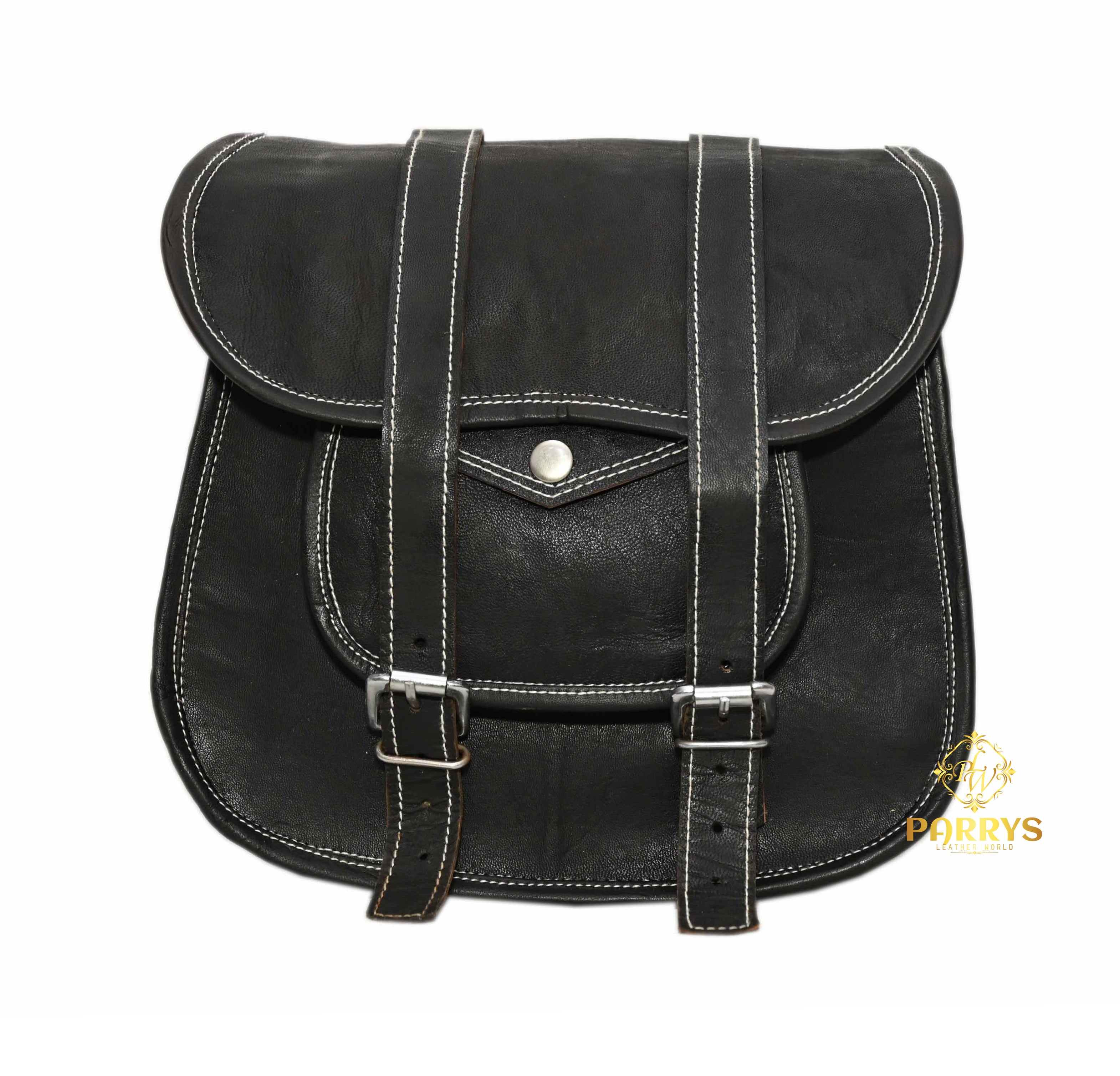 Elevate your ride and style with the distinctive Classic Black Curved leather Saddle bag (Pack of 2). Handcrafted from genuine full-grain leather, this matching pair features a timeless classic black finish beautifully accented by bold white contrast stitching. Each bag's unique curved flap design exudes a vintage charm, making them perfect for adding a touch of rugged sophistication to your motorcycle, bicycle, or personal aesthetic.