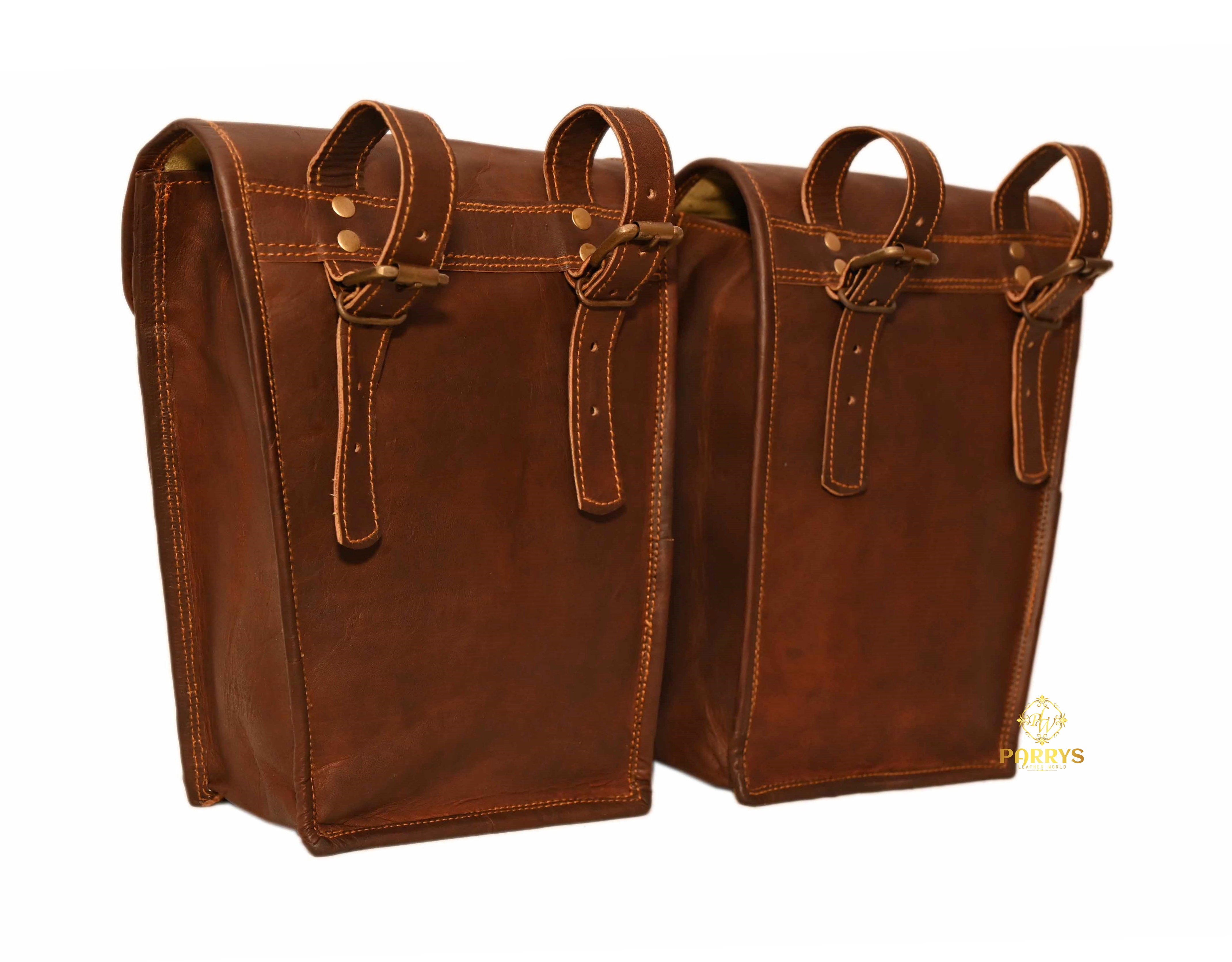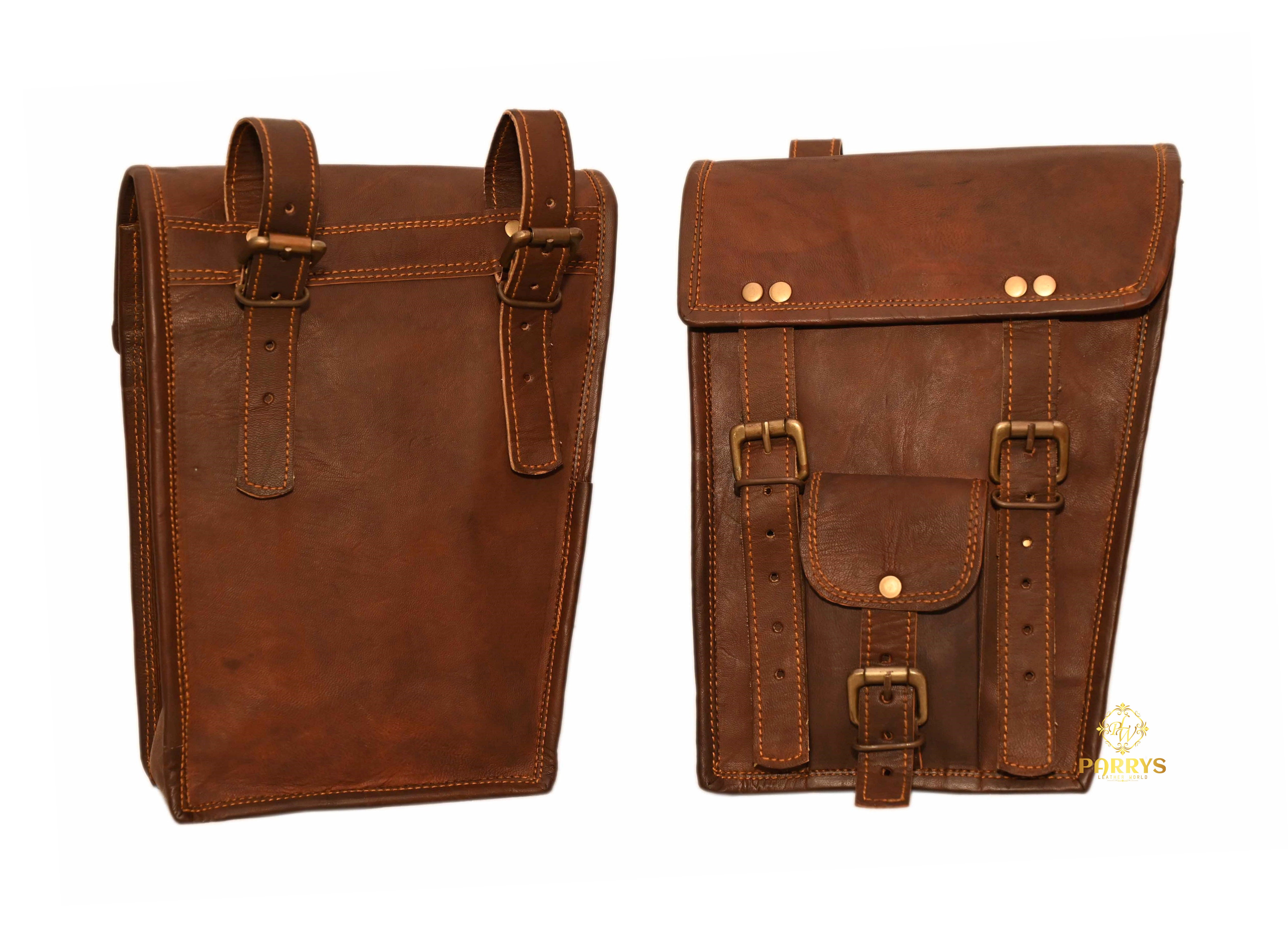 Built for both enduring appeal and practical efficiency, each bag in this convenient set of two offers secure and compact storage for your essentials. The traditional front flap, fastened by two prominent buckle straps, ensures your belongings are protected on every journey. Ideal for symmetrical mounting on motorcycles or bicycles, these bags provide balanced storage, or can be carried individually as distinctive and versatile accessories for any adventure.