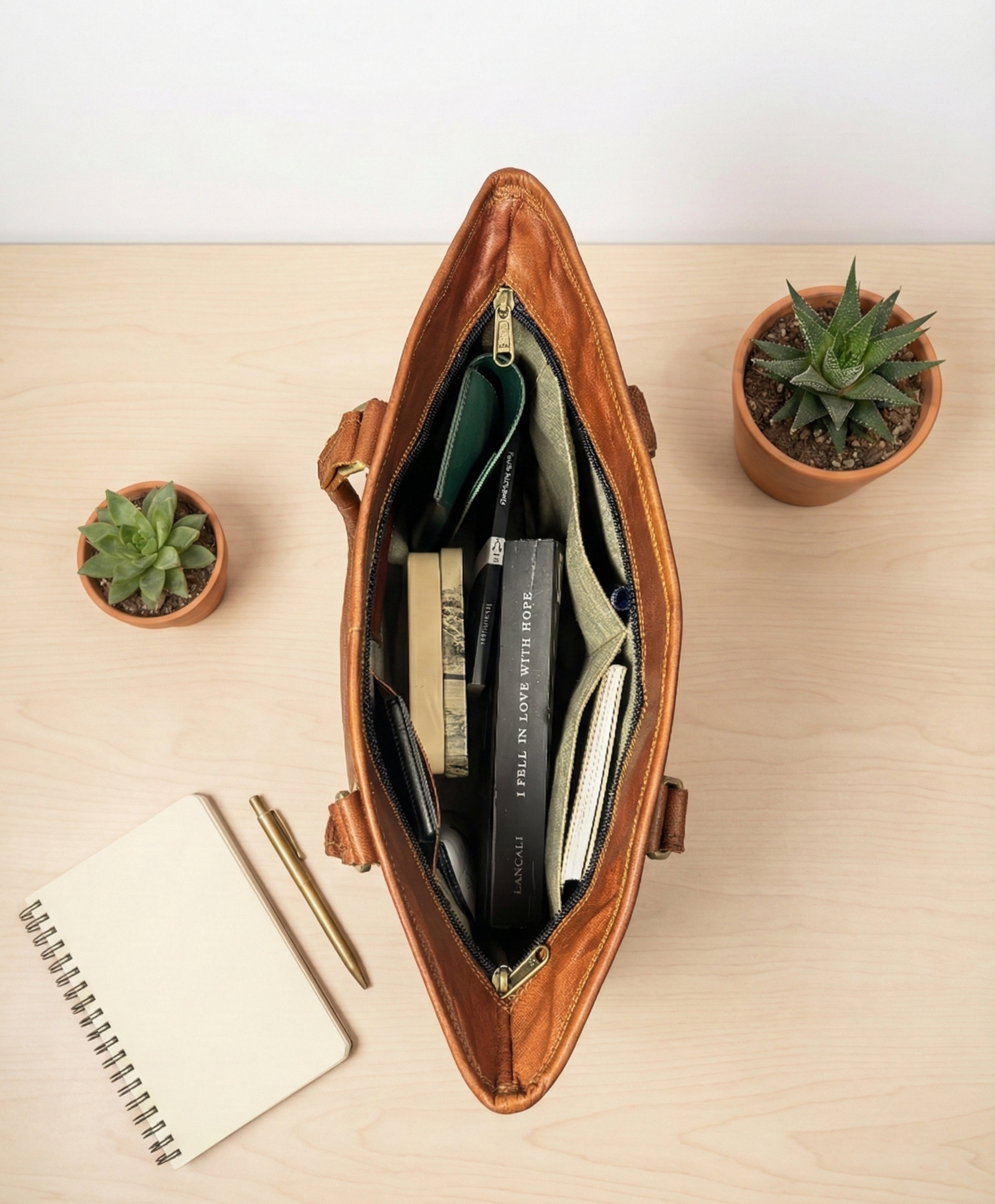 Designed for effortless organization, it features a spacious interior with thoughtfully placed pockets and a soft yet sturdy cotton lining. The structured silhouette is complemented by antique brass hardware and a detachable crossbody strap, giving you the freedom to style it your way chic on the shoulder or hands-free on the go.